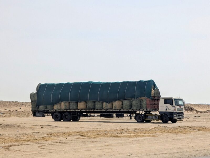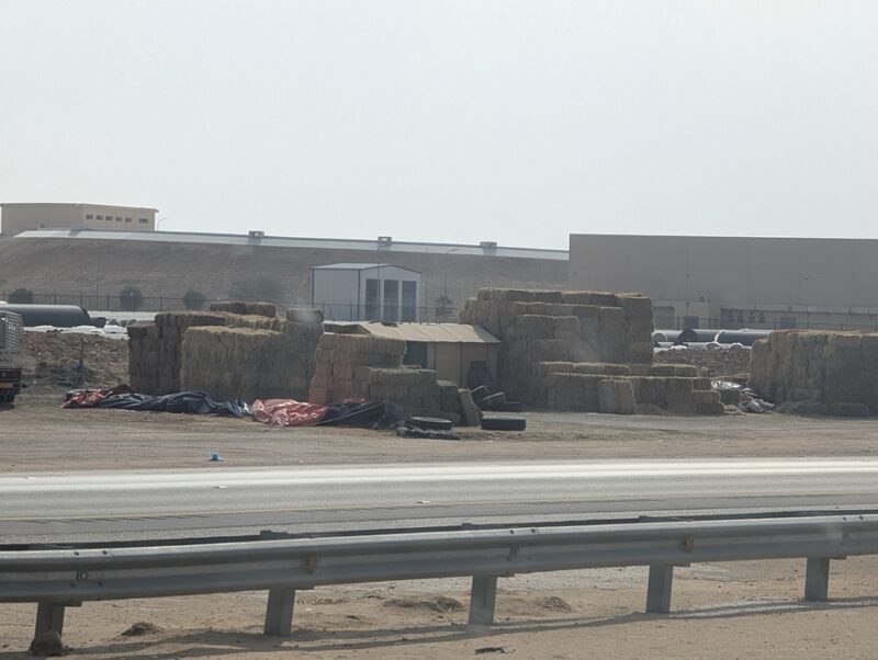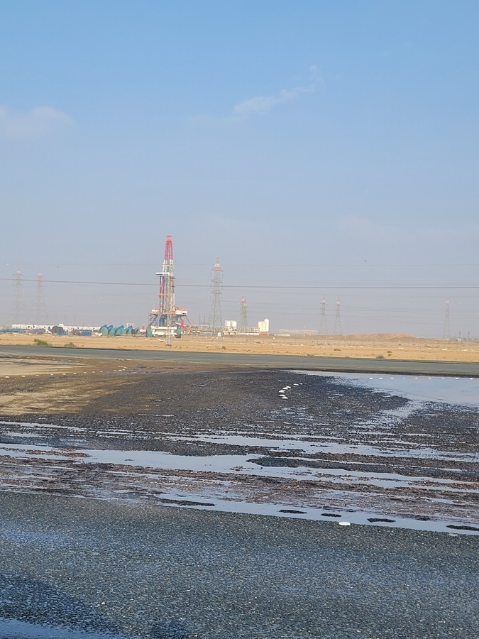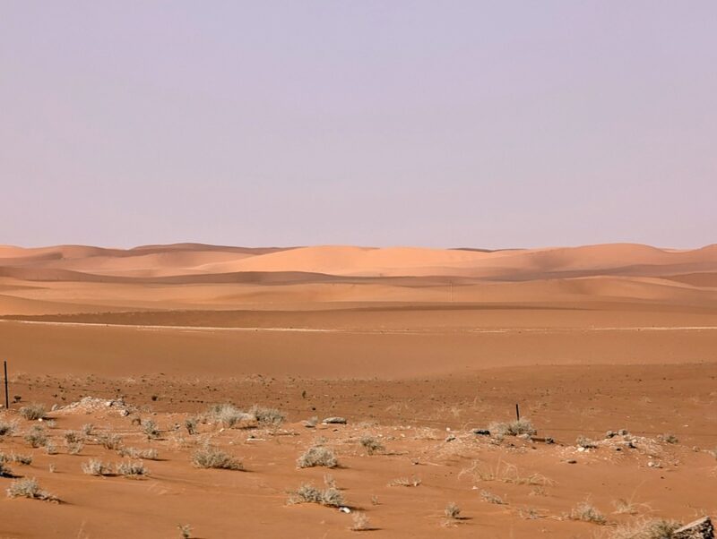 Cette fois l’envie de découvrir l’Empty Quarter nous pousse à emprunter une route qui part plein sud à travers des plaines désertiques occupées par des installations pétrolifières et gasifières, puis passé le tropique du cancer nous arrivons sur une zone irriguée avec palmiers et cultures fourragères.