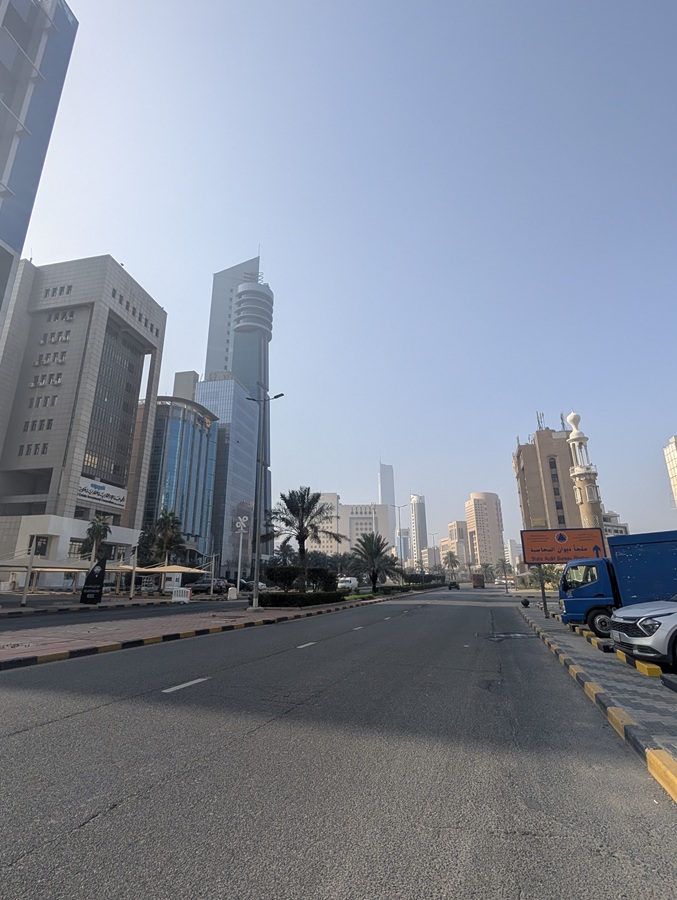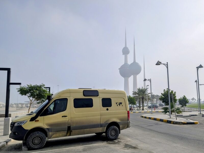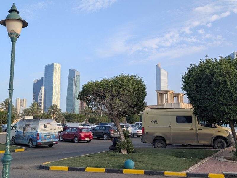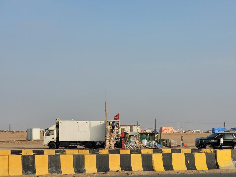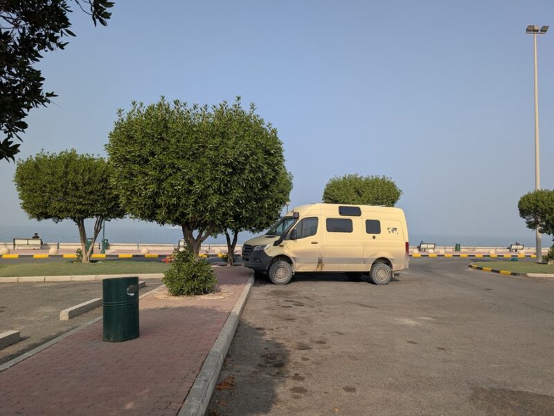 Nuitée sur le parking d’un centre commercial moderne. Le lendemain dernier arrêt en Iraq sur le parking d’une station service à quelques kilomètres de la frontière avec le Koweït.