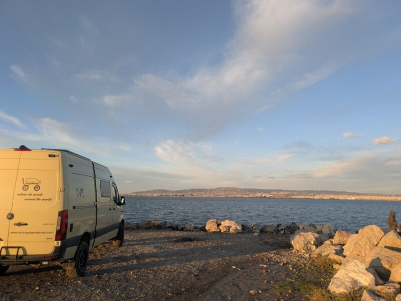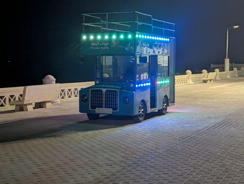 Nous nous promenons le long de la mer où un petit bus tout décoré nous propose d’aller faire un tour.