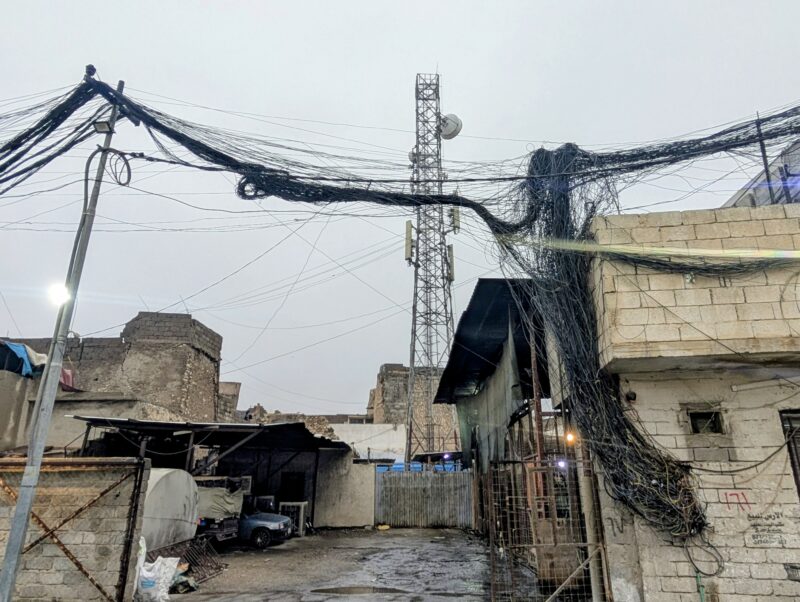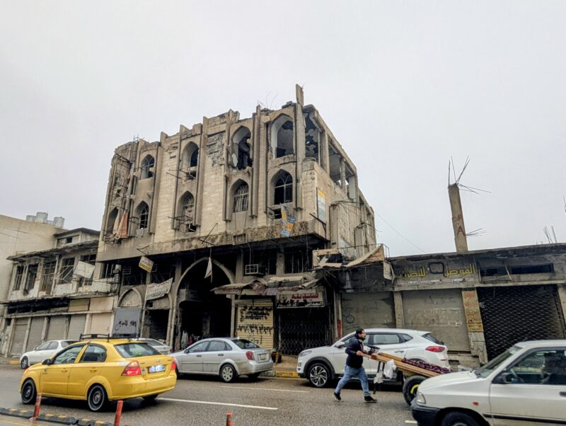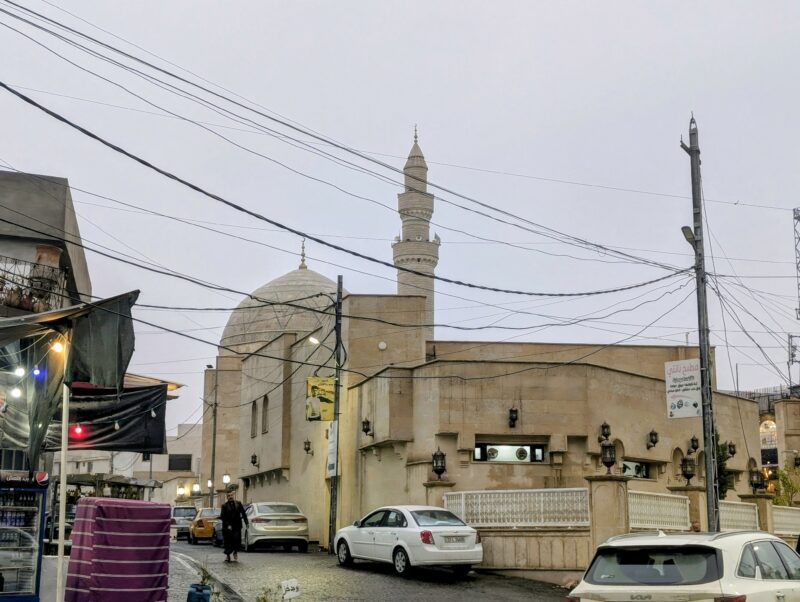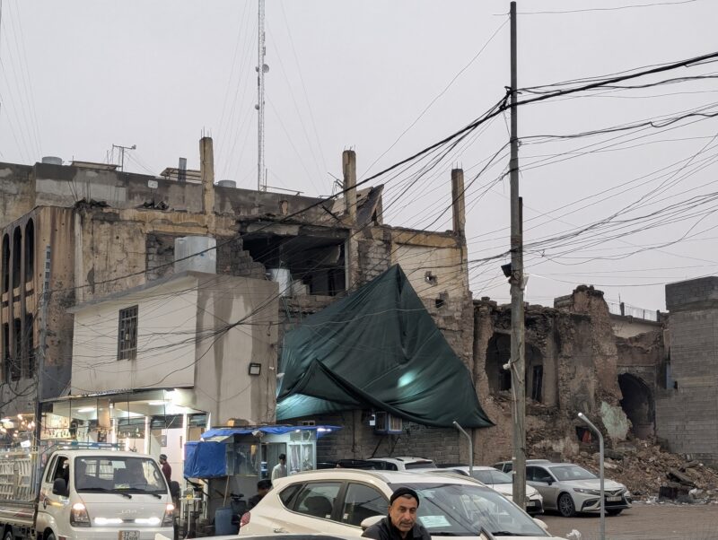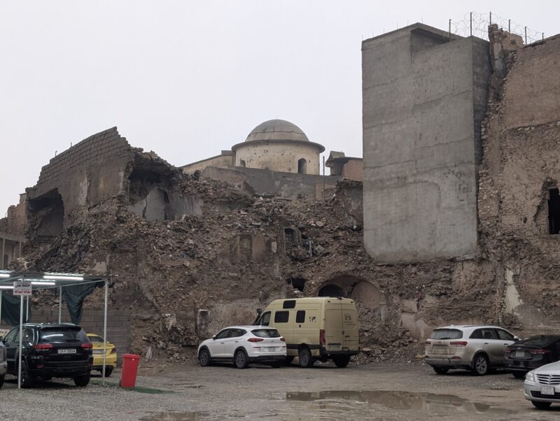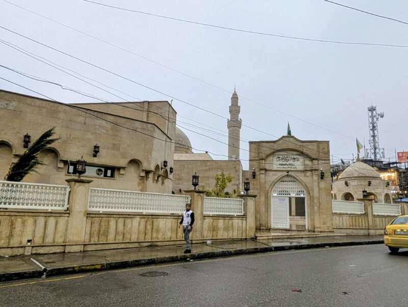 Nous ne ralentissons toujours pas pour la traversée de l’Iraq en 3 jours sous la pluie et nous roulons sur une route détrempée parfois envahie par la boue avec des bas côtés jonchés de plastiques sur des centaines de kilomètres puis nous arrivons à Mossoul pour la première nuit sur un parking lui aussi boueux dans le centre ville. Une balade dans ce quartier nous impressionne car les séquelles des bombardements de 2017 sont encore bien présentes. Dans le quartier où nous étions seule la mosquée a été reconstruite…