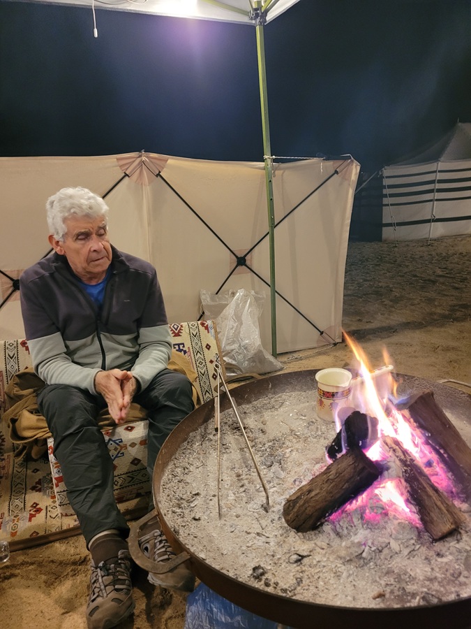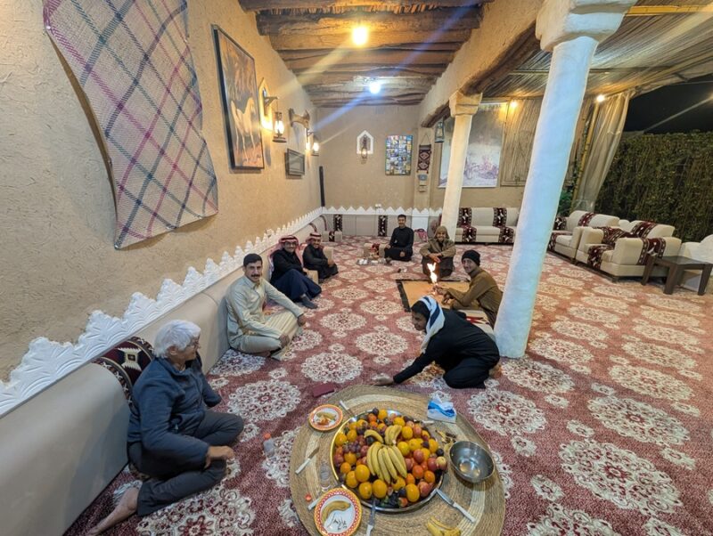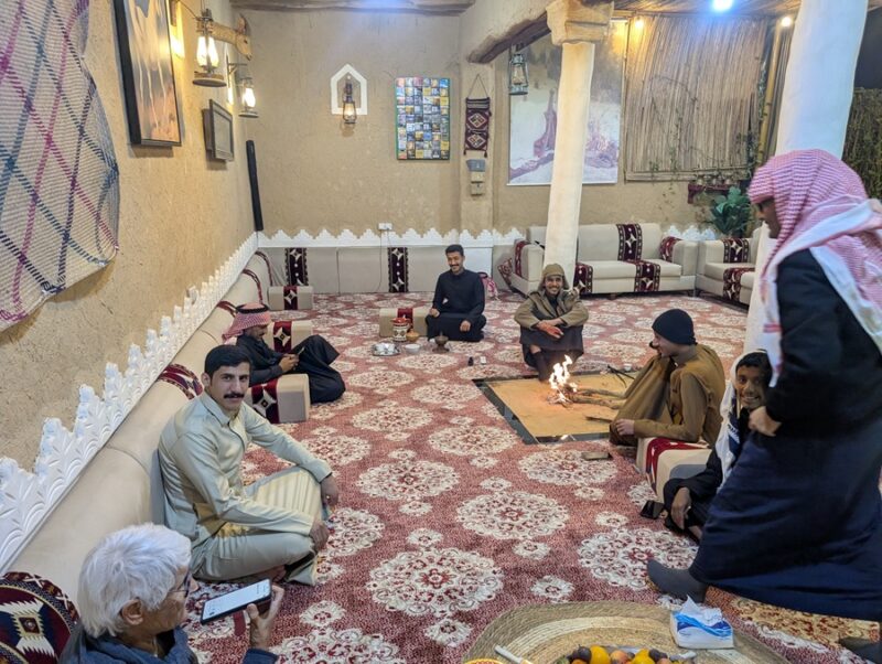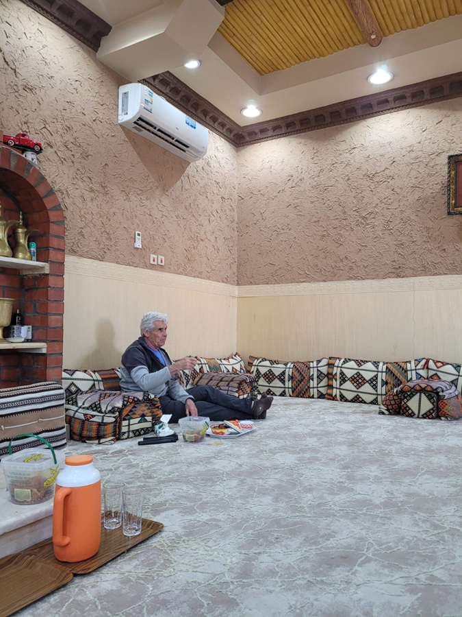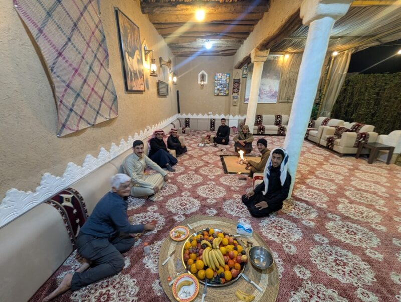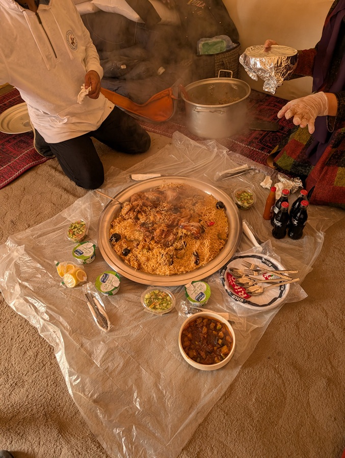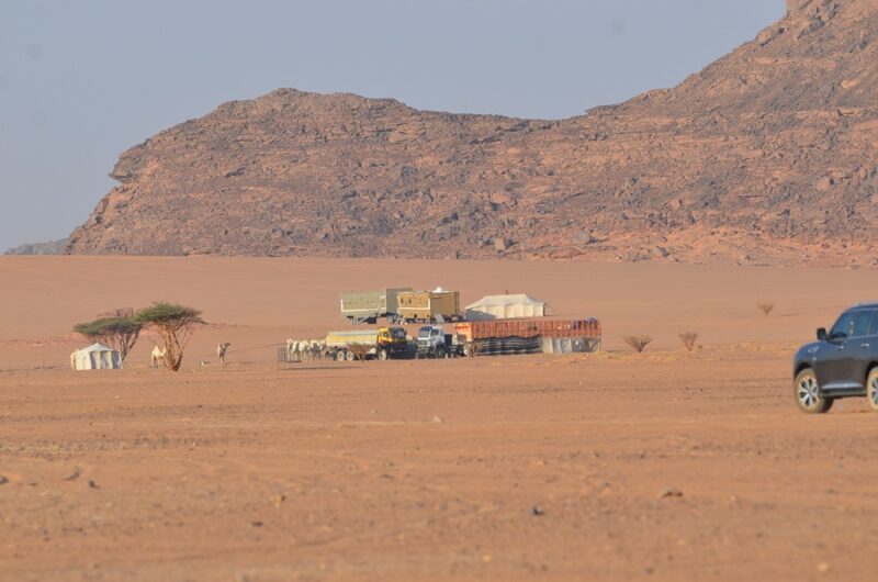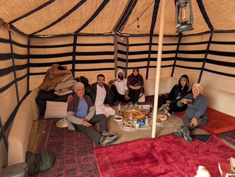 En revenant au fourgon, nous sommes abordés par Baker venu se garer à côté de nous. Il nous propose de nous rendre le lendemain à son campement pour rencontrer ses parents et sa femme puis manger un plat saoudien. Vers 13h nous arrivons dans cette famille on ne peut plus sympathique et de bonne humeur où nous avons été reçus comme des rois. Le repas fut excellent et Françoise s’est régalée à manger avec les doigts. Nous avons échangé sur nos familles respectives ainsi que sur nos professions. L »après midi,après avoir changé de tente, ils nous ont servi un excellent dessert aux dattes. Françoise a bien observé et noté la recette pour pouvoir le refaire dès que possible.
