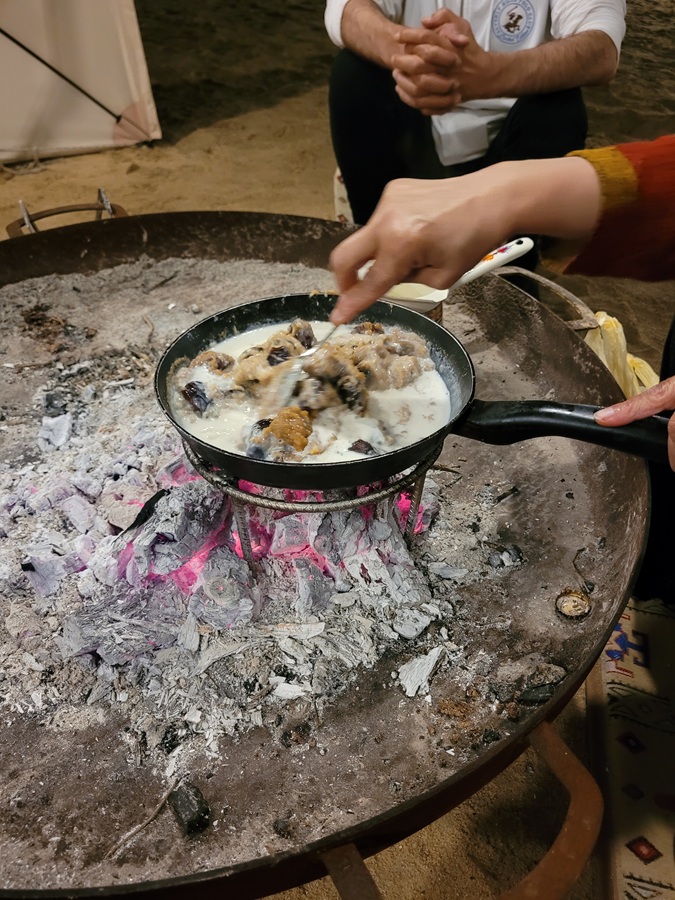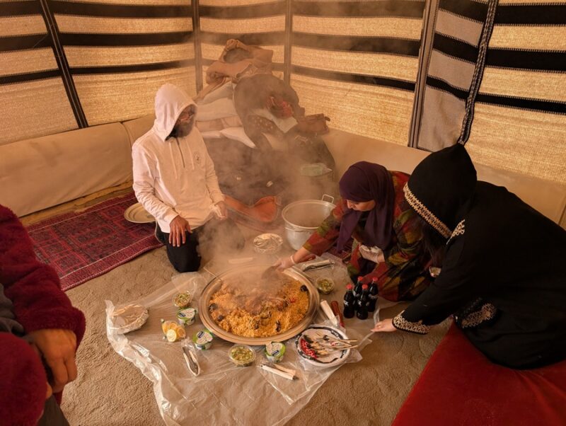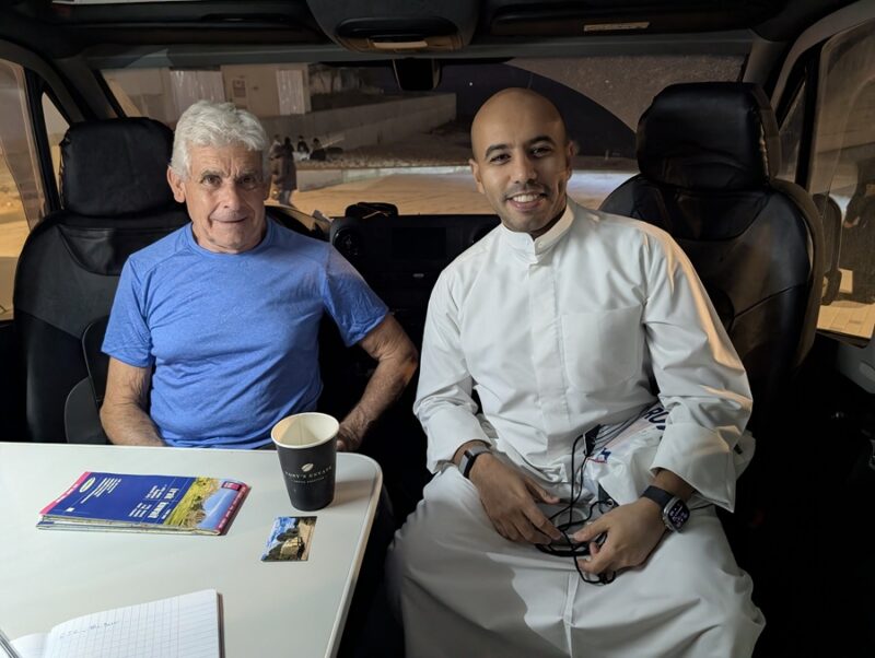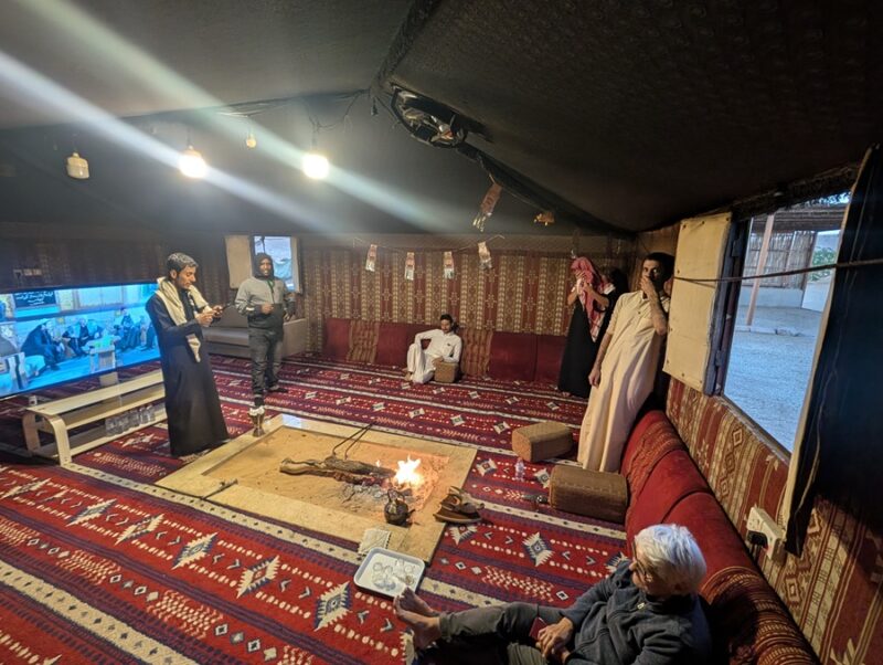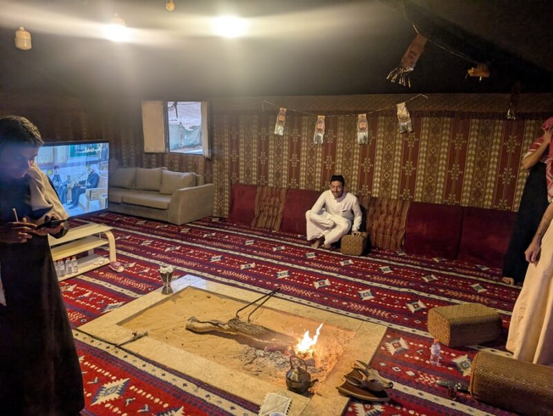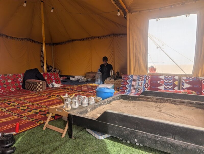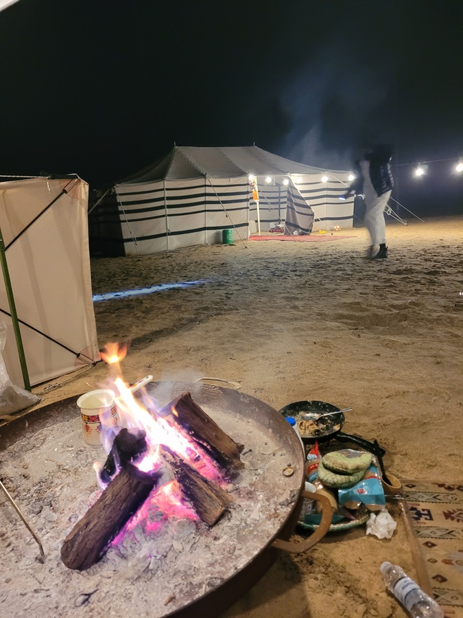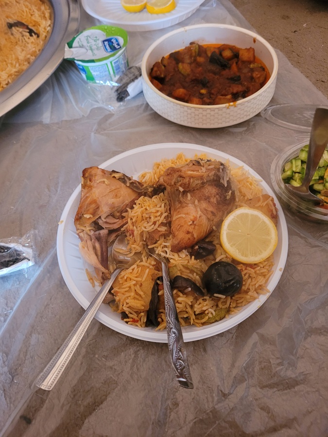 En revenant au fourgon, nous sommes abordés par Baker venu se garer à côté de nous. Il nous propose de nous rendre le lendemain à son campement pour rencontrer ses parents et sa femme puis manger un plat saoudien. Vers 13h nous arrivons dans cette famille on ne peut plus sympathique et de bonne humeur où nous avons été reçus comme des rois. Le repas fut excellent et Françoise s’est régalée à manger avec les doigts. Nous avons échangé sur nos familles respectives ainsi que sur nos professions. L »après midi,après avoir changé de tente, ils nous ont servi un excellent dessert aux dattes. Françoise a bien observé et noté la recette pour pouvoir le refaire dès que possible.