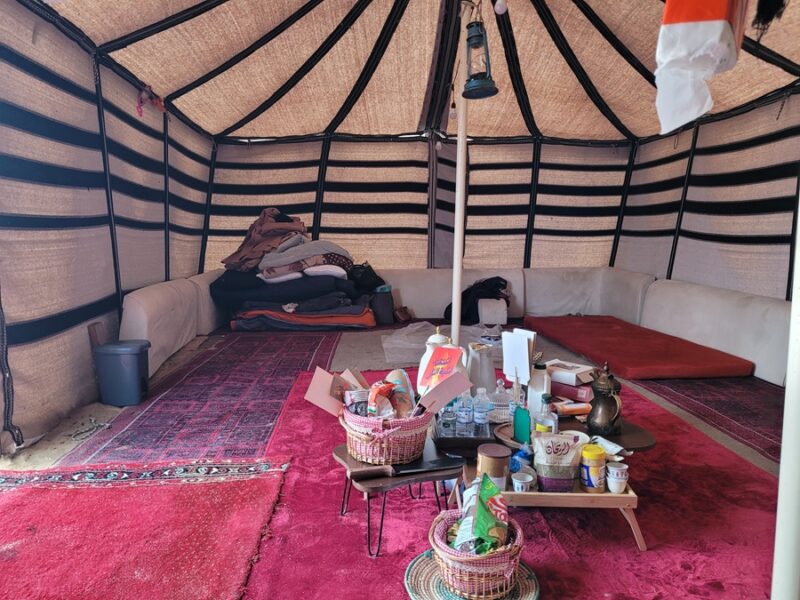 Des nomades nous invitent à les suivre jusqu’à leur campement. La discussion tourne en boucle autour de leur incompréhension sur notre motif de poursuivre notre chemin dans ce désert. Ils nous ont inlassablement répété que c’était dangereux jusqu’à ce que nous promettions de ne pas le faire !