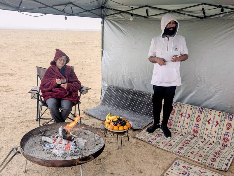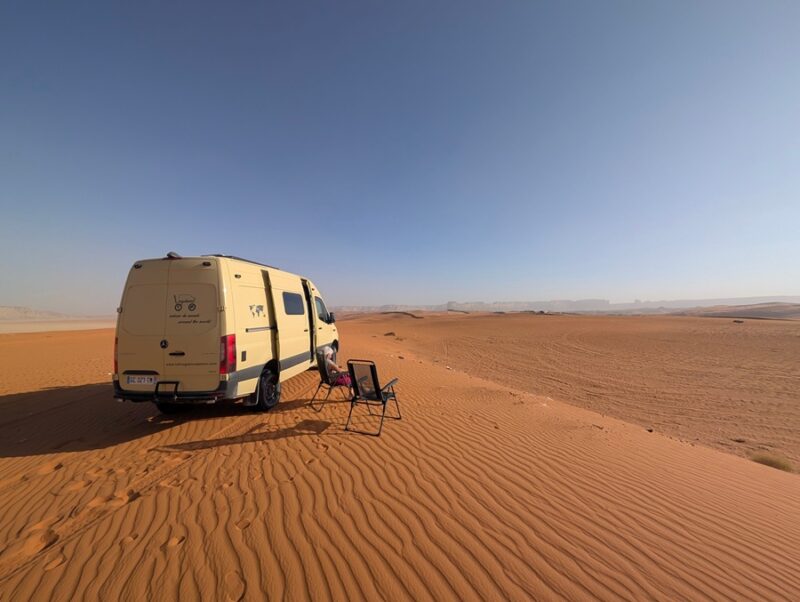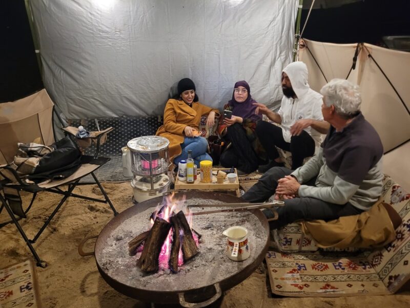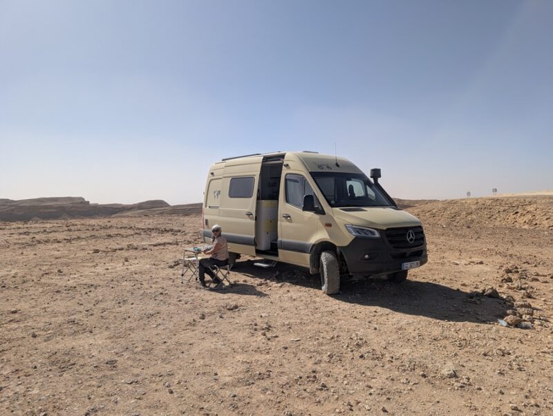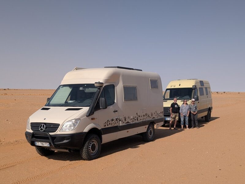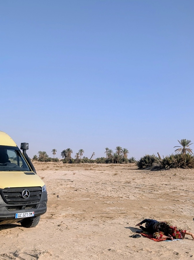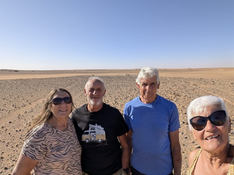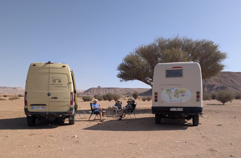 Installés tranquillement Françoise lit, Alain arrange les photos pour polarstep, un gros 4×4 s’approche de nous et ses occupants nous invitent à les suivre pour partager thé, dattes et café tout ça avec des rudiments d’anglais ainsi que google traduc.