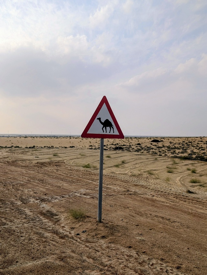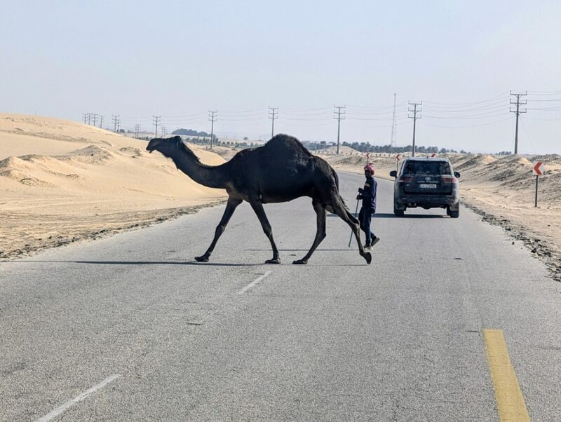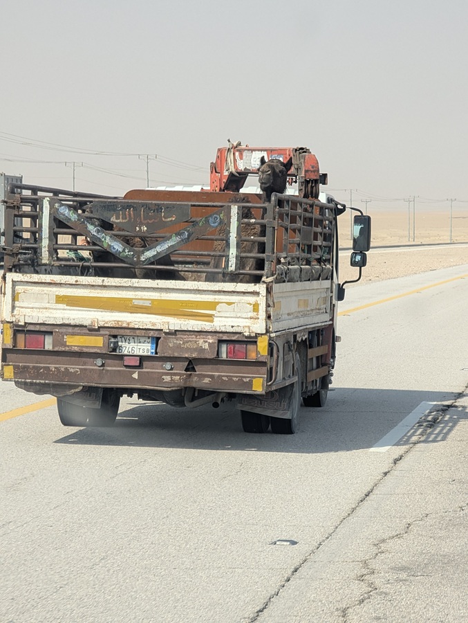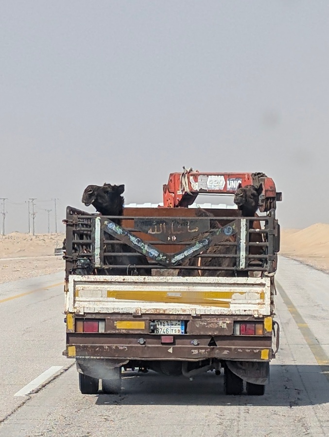 Après un bivouac sur la plage d’Al Ahsa, nous partons plein ouest par une route 2×2 voies à travers le désert de sable. Nous rattrapons un dépanneur de dromadaires,
