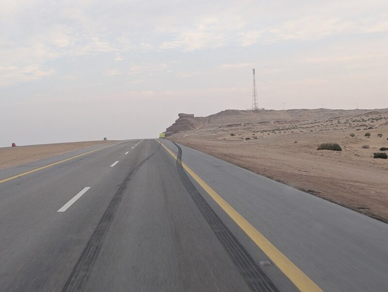 Pour sortir du camp de Baker et pour éviter de faire des kilomètres supplémentaires nous traversons le terre plein central de l’autoroute. Ce qui est habituel pour les saoudiens.