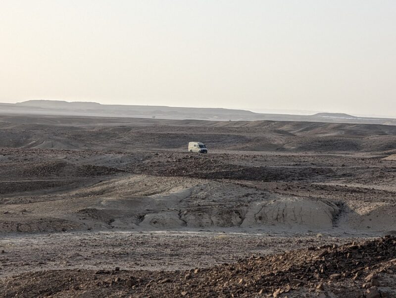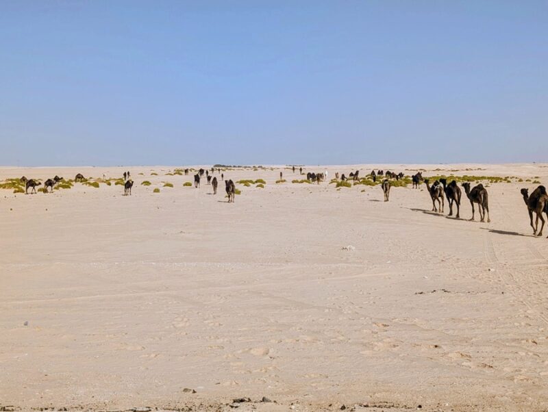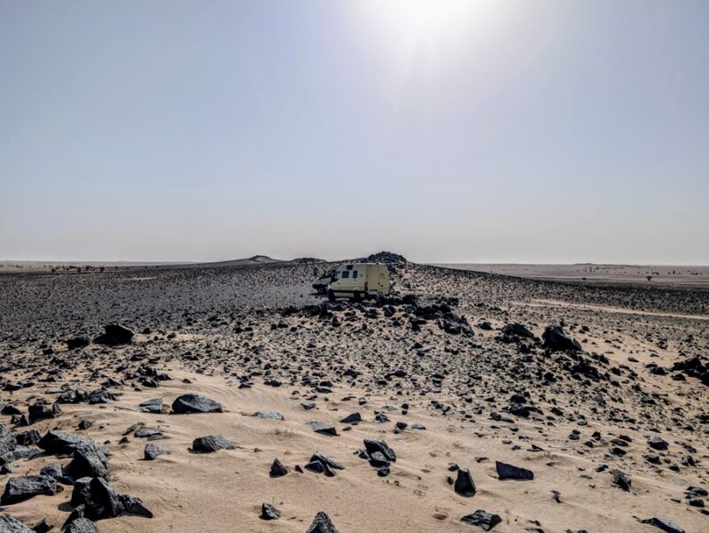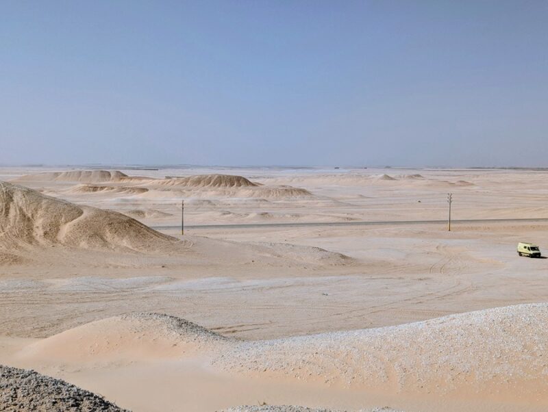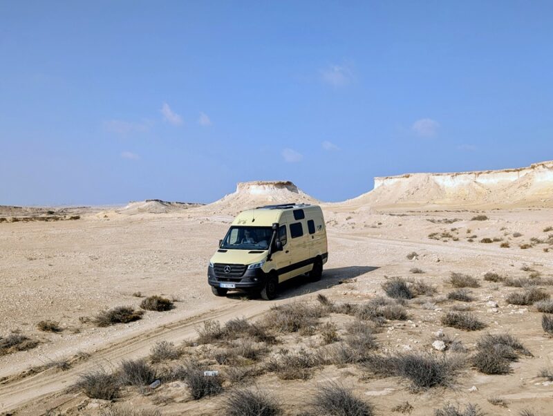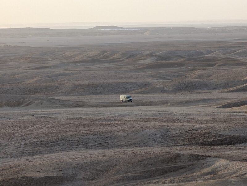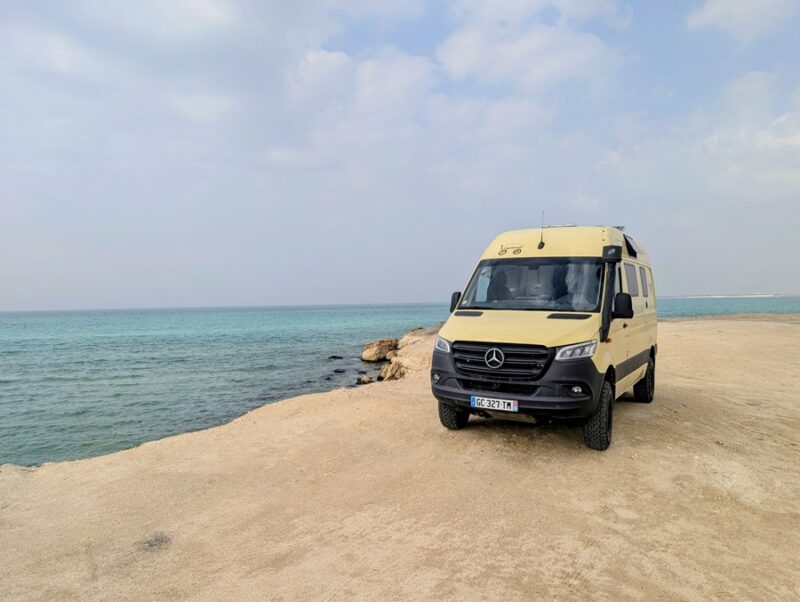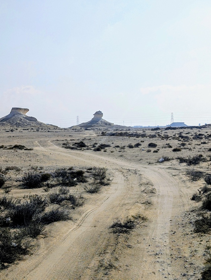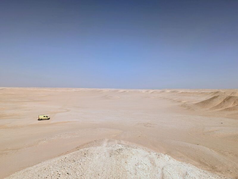 C’est en remontant la côte ouest vers Zekreet nous apercevons une piste qui part dans une zone agrémentée de sable et rochers. Nous l’empruntons aussitôt car les possibilités de sortir de la route sont rares.