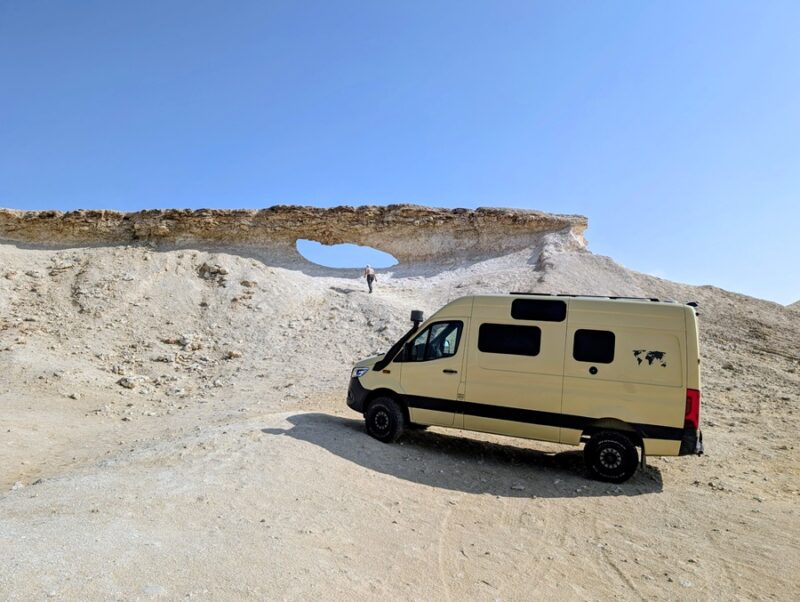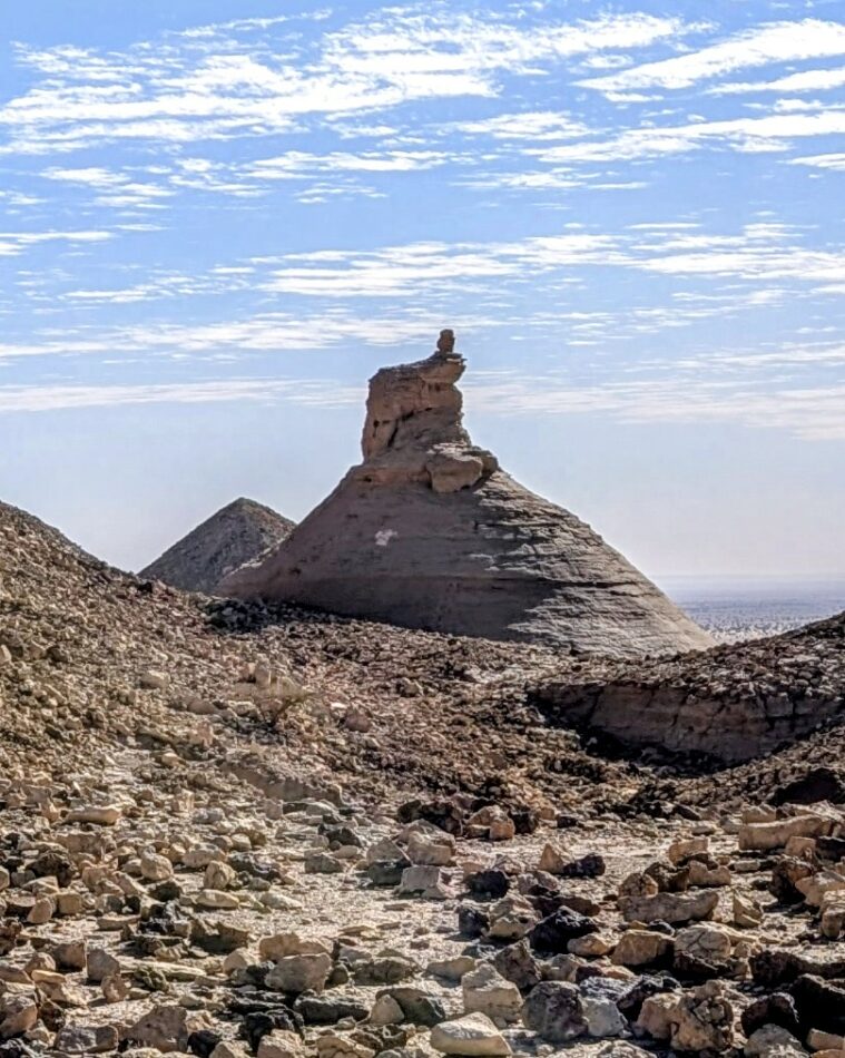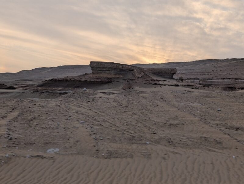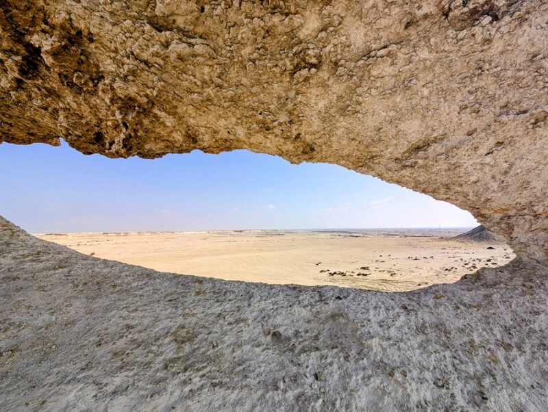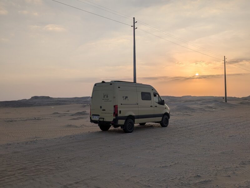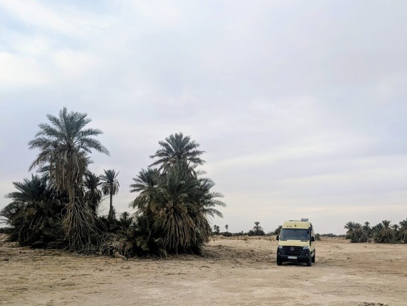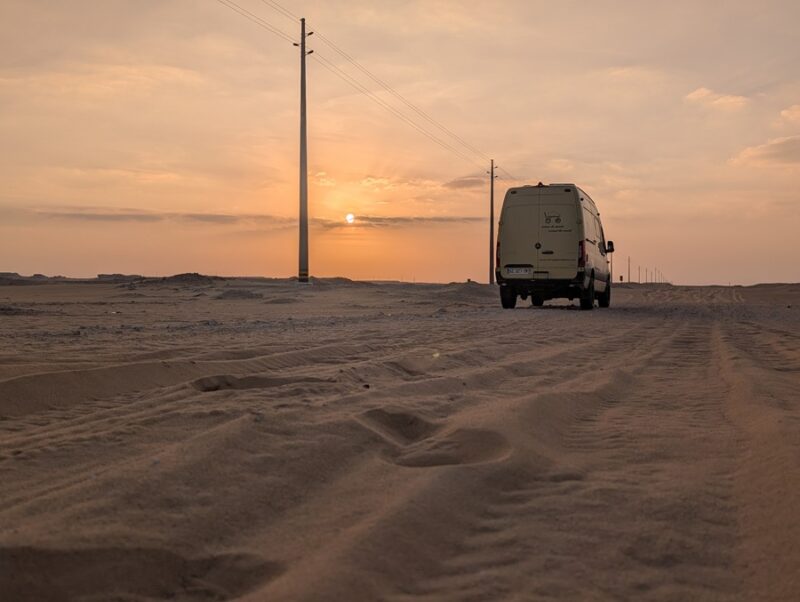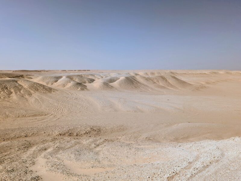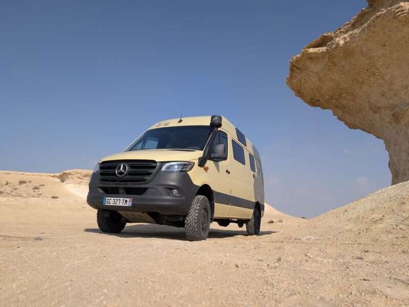 C’est en remontant la côte ouest vers Zekreet nous apercevons une piste qui part dans une zone agrémentée de sable et rochers. Nous l’empruntons aussitôt car les possibilités de sortir de la route sont rares.