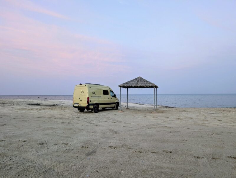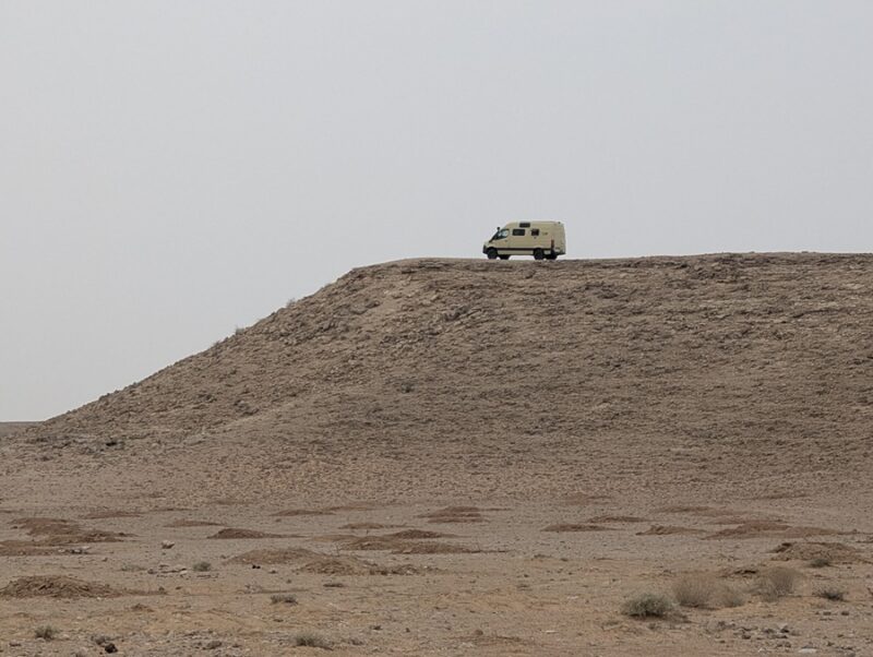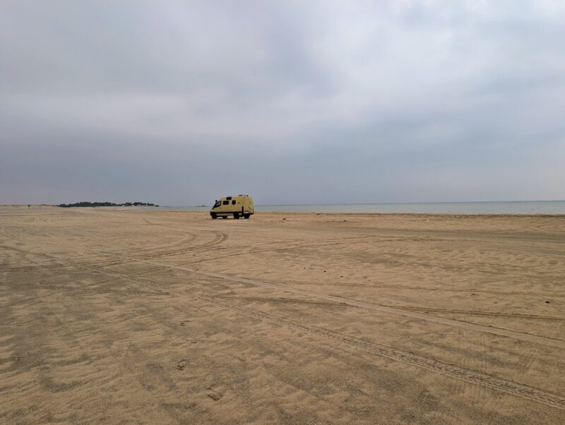 A midi nous nous arrêtons sur une grande plage de la côte ouest. Nous étions seuls. Peut-être à cause de l’orage qui est venu sur nous avec de gros coups de vent. Nous avons donc repris la route pour trouver un parking abrité, chose faite à Dukhan.