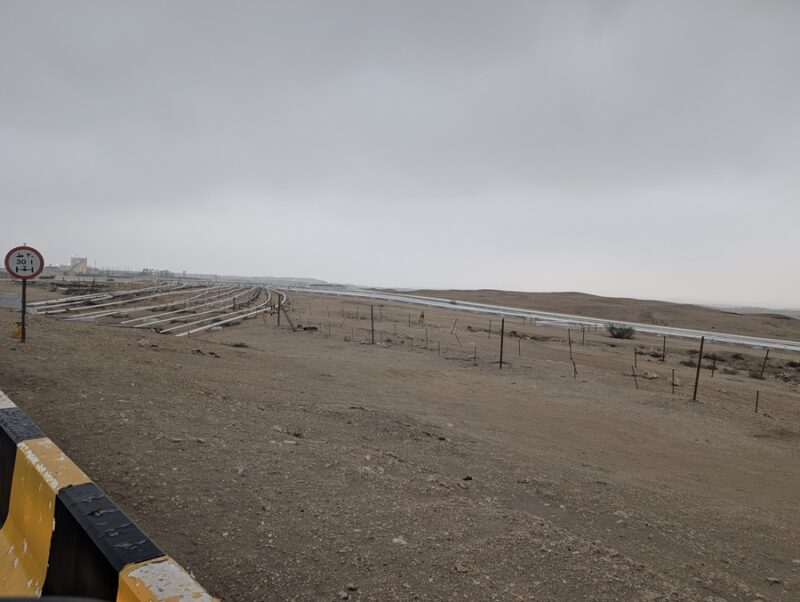 Pas facile de s’écarter de la route pour trouver un bivouac car elle est bordée de clôtures (peut-être pour empêcher les dromadaires de traverser?).