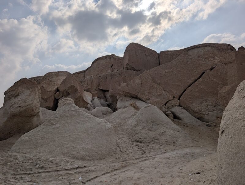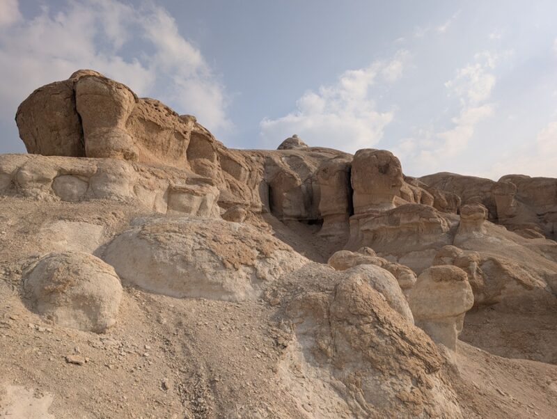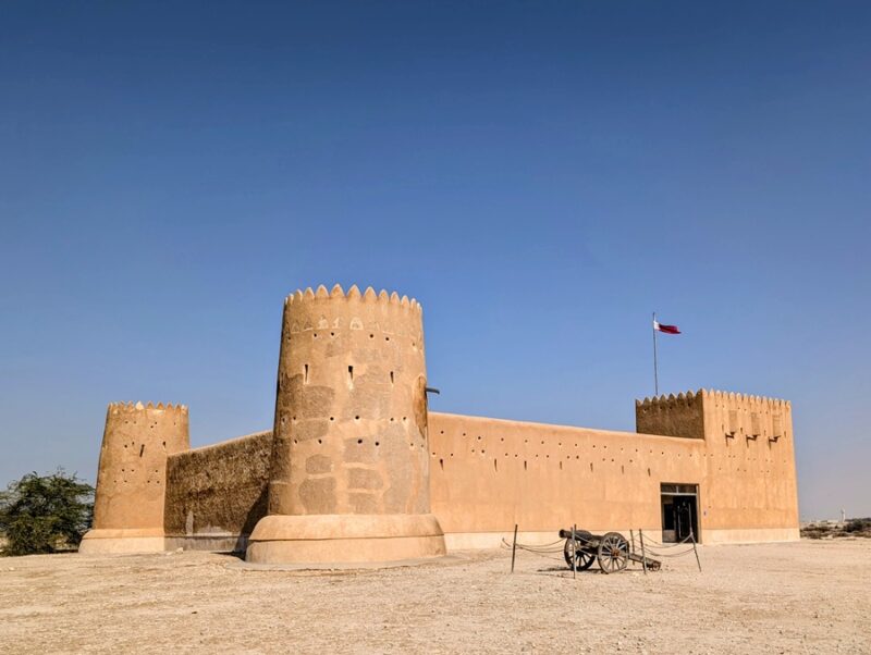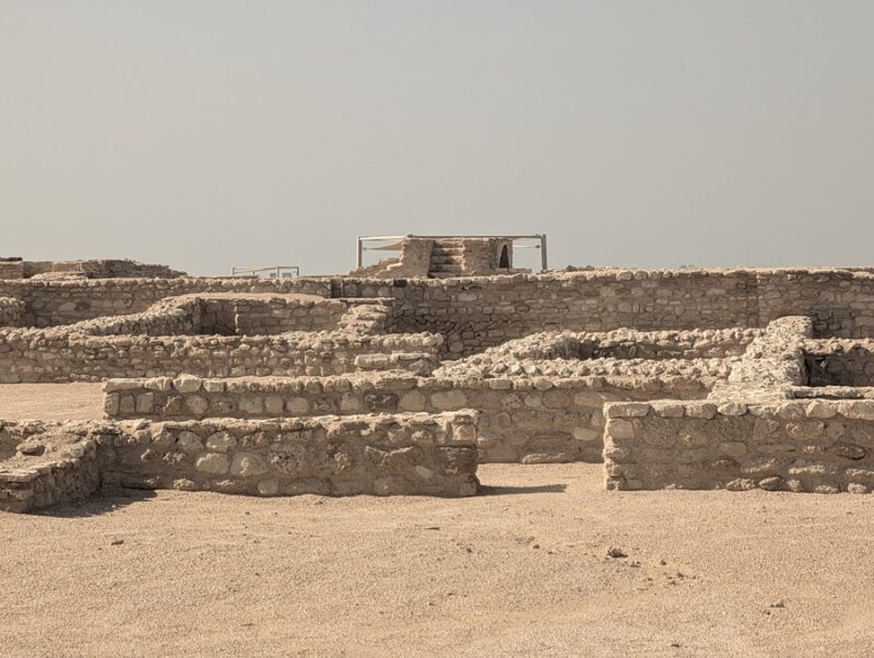 Nous continuons notre route vers le nord où nous nous arrêtons au fort d’Al Zubahrah où il nous a été proposé de nous amener gratuitement en bus sur le site protégé des fouilles de mise au jour de ce qui fut aux 17ème et 18ème siècles une ville portuaire prospère grâce aux huîtres perlières.