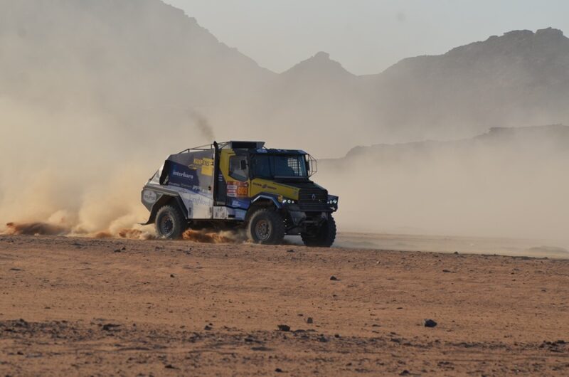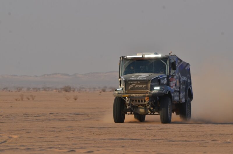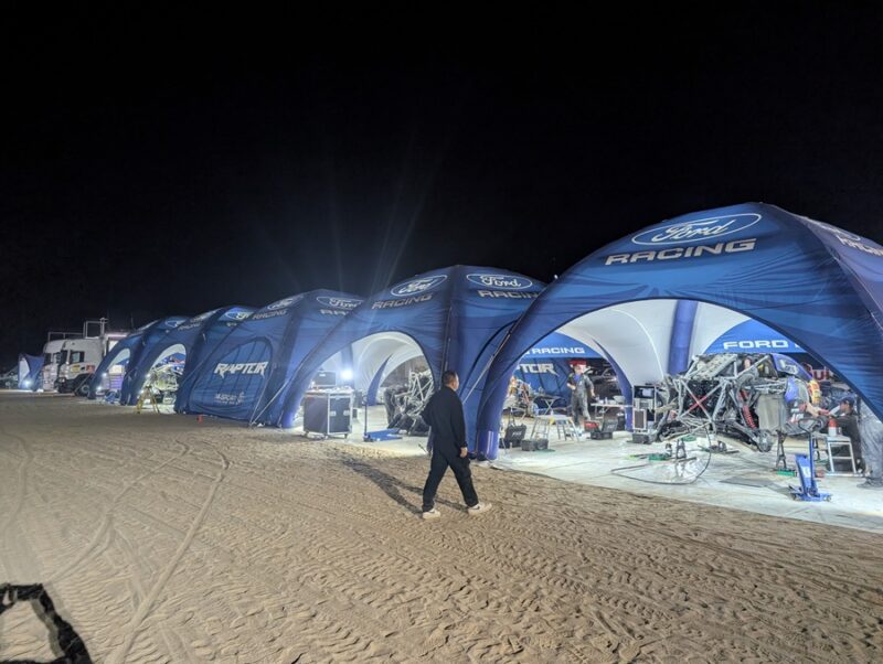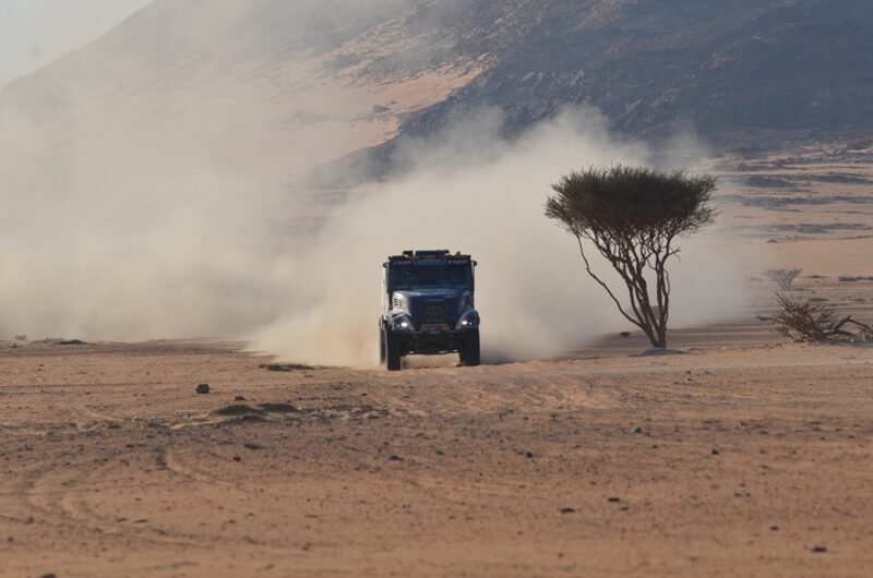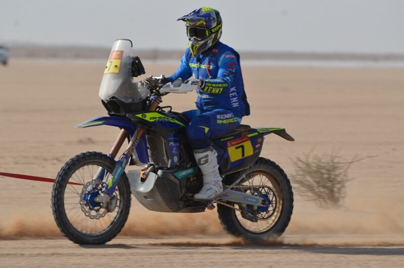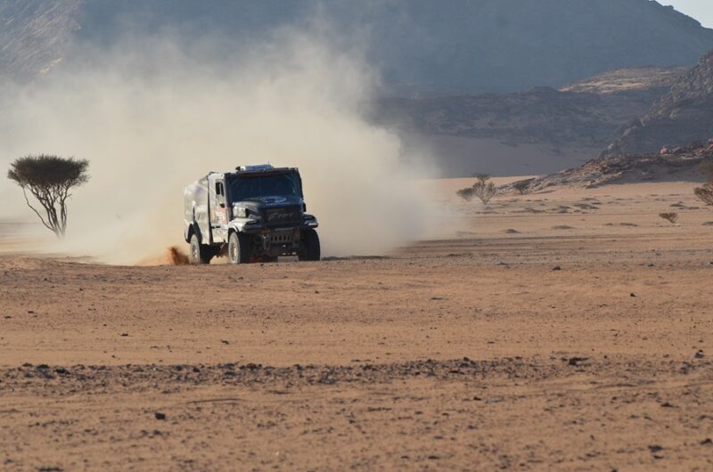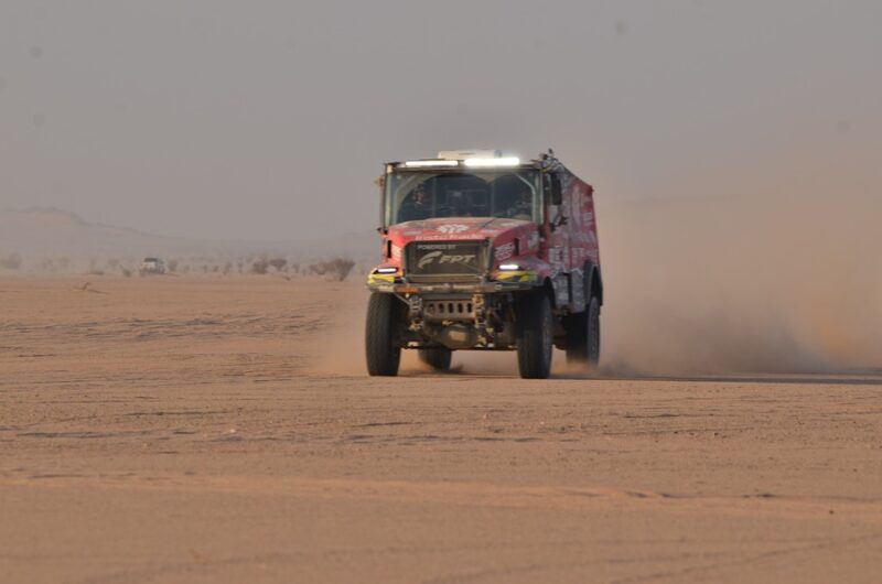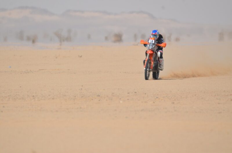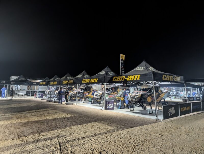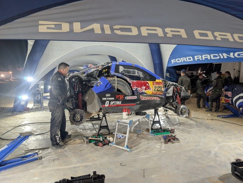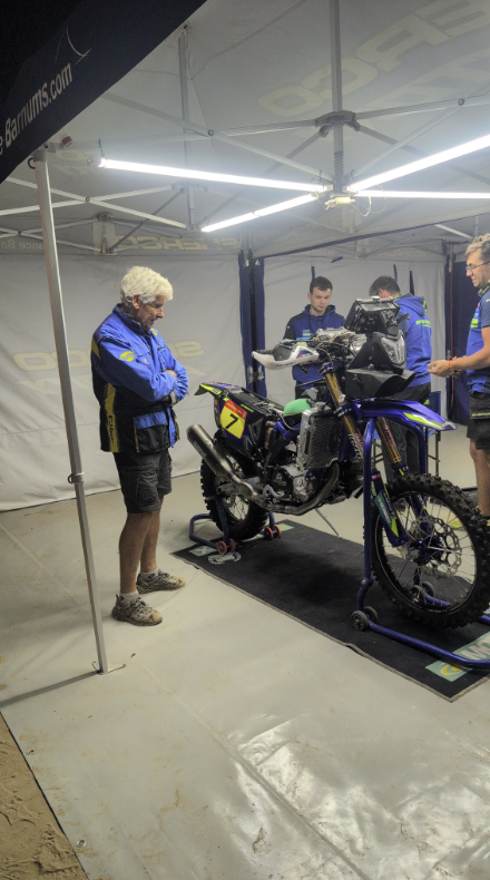 Le soir nous entrons dans le bivouac, invités par l’équipe Sherco. Alain était ravi de retrouver ses anciens collègues et de pouvoir féliciter le pilote. La nuit fut bruyante car nous avons dormi sur le parking du bivouac avec les groupes électrogènes, les essais des véhicules une fois la révision terminée puis dès 5h du matin le départ des premiers motards.