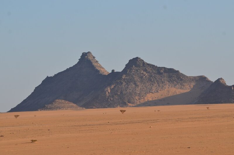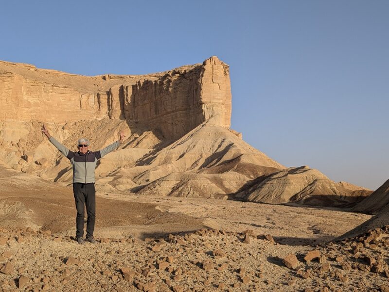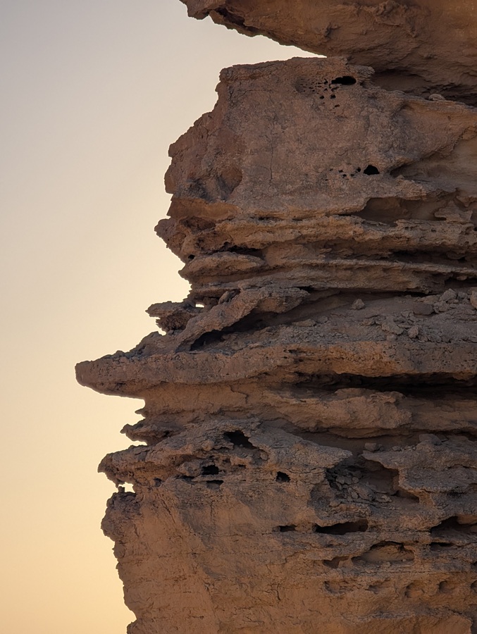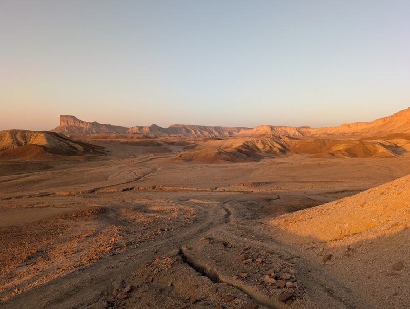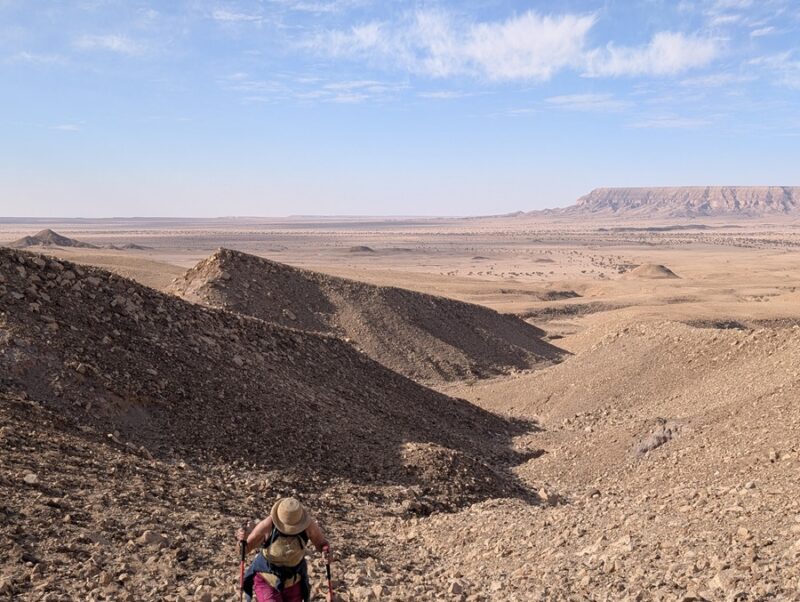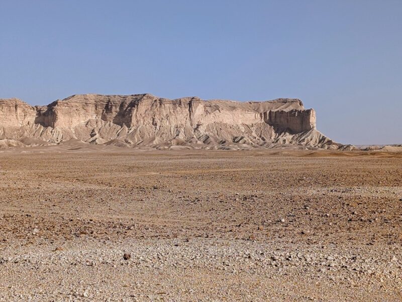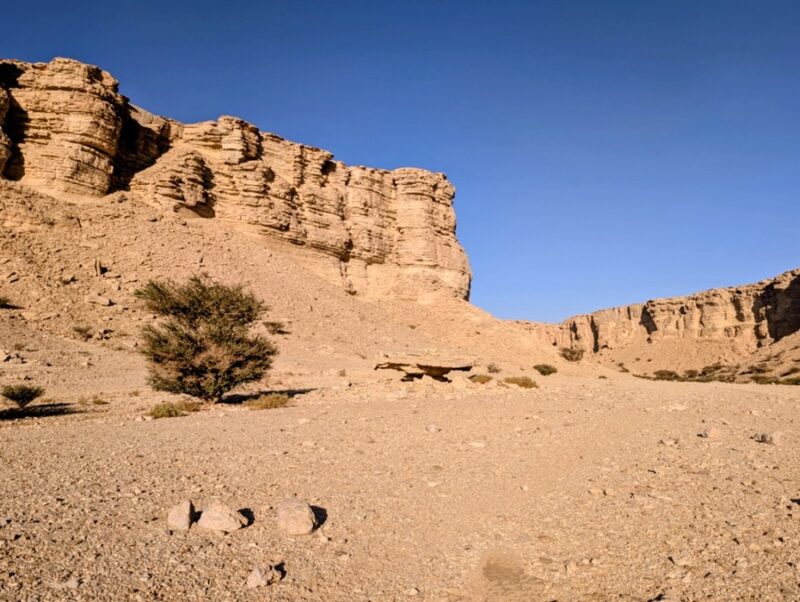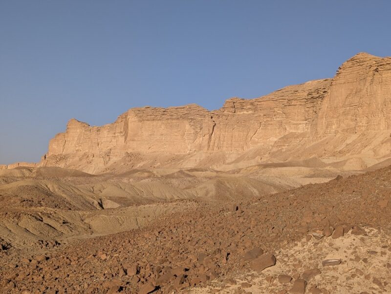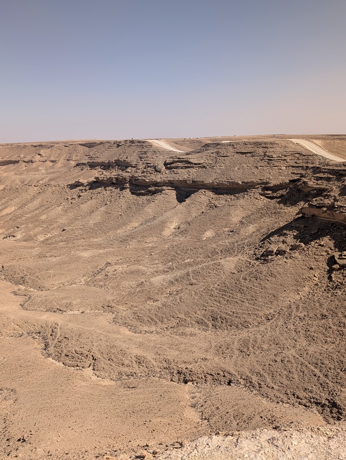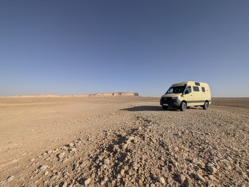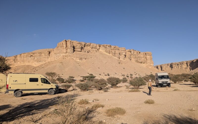 Retournés sur la route, nous longeons les falaises à bonne distance et l’idée nous vient de quitter le goudron pour nous en approcher afin de les longer à leur pied. Ne trouvant aucune piste, nous improvisons à travers sable et cailloux, traversant de nombreux petits wadis sur 40km sans rencontrer âme qui vive, il ne restait que la carcasse du seul dromadaire rencontré. C’est donc au milieu de rien que nous réveillonons pour le passage en 2026. Nous avons passé 3 jours à rouler au milieu de ces paysages magnifiques.