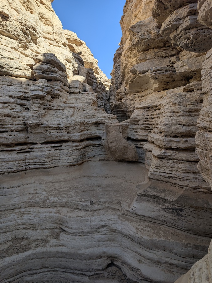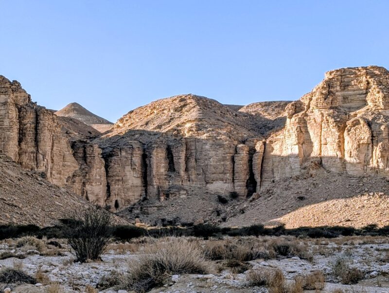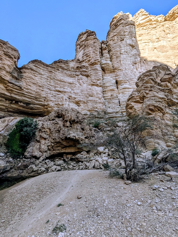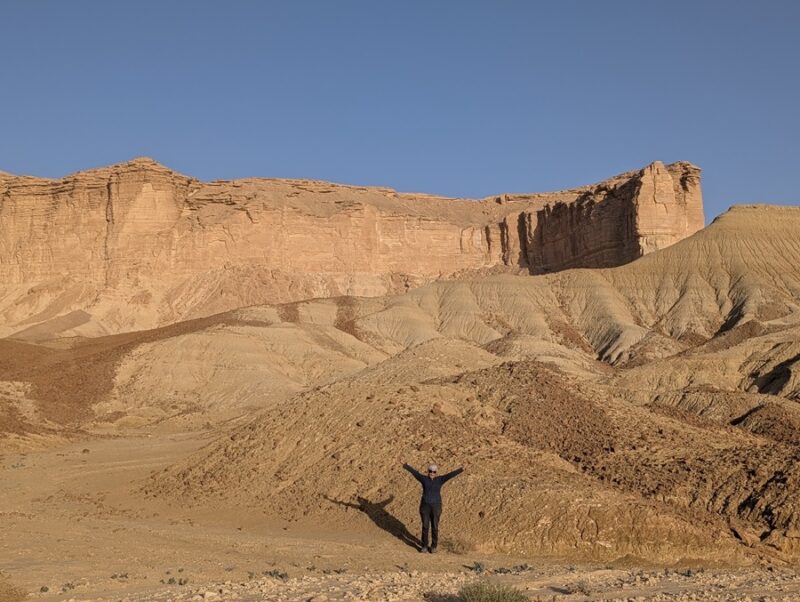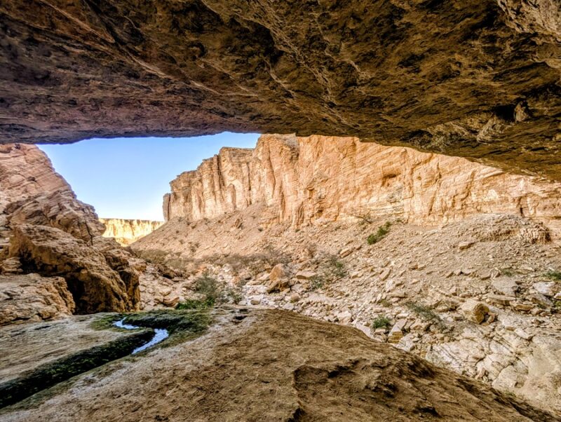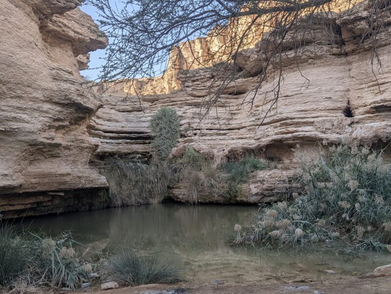 Le jour suivant nous nous levons à 5h30 pour nous rendre à la réserve avant le lever du soleil. La température est bien fraîche, nous nous couvrons bien surtout que le 4×4 du gardien n’avait pas de chauffage. La visite dure 2h mais s’est avérée pauvre en animaux (2 biches). Par contre les paysages sont magnifiques. Nous remontons un oued jusqu’à une source d’eau chaude au pied de belles falaises.