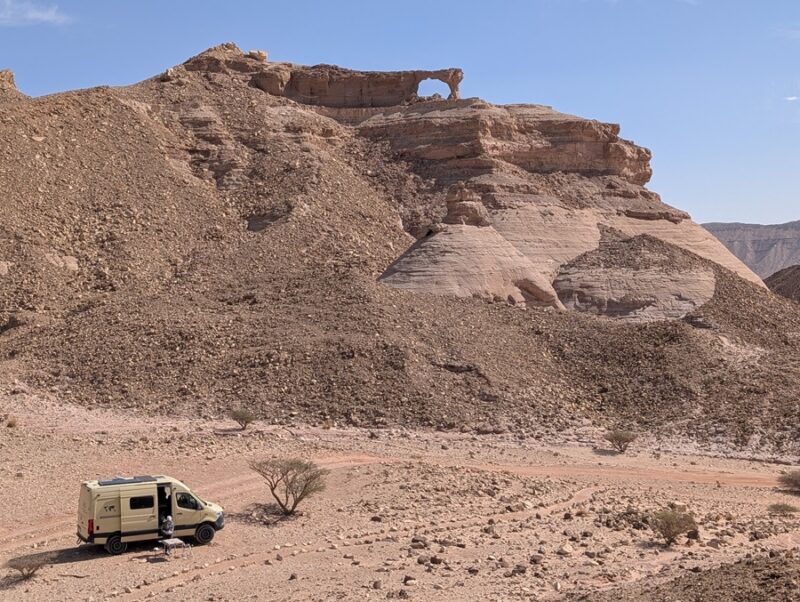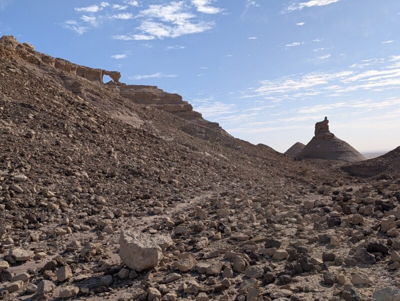 A midi, nous nous arrêtons en bord de piste près d’une arche naturelle que nous avons tenté d’atteindre à pied dans les éboulis.