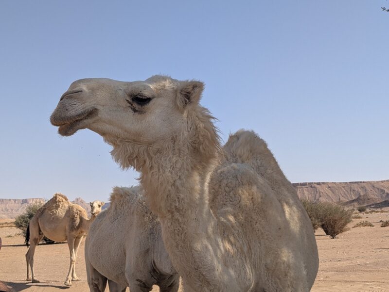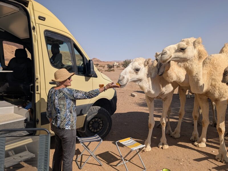 Lors d’une pause dîner , les dromadaires viennent faire les curieux et manger quelques oranges