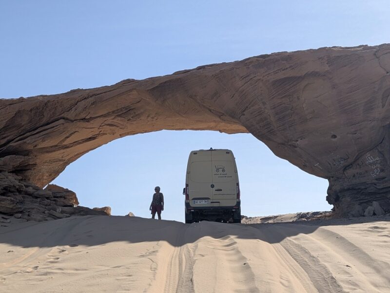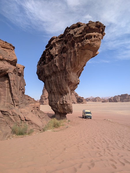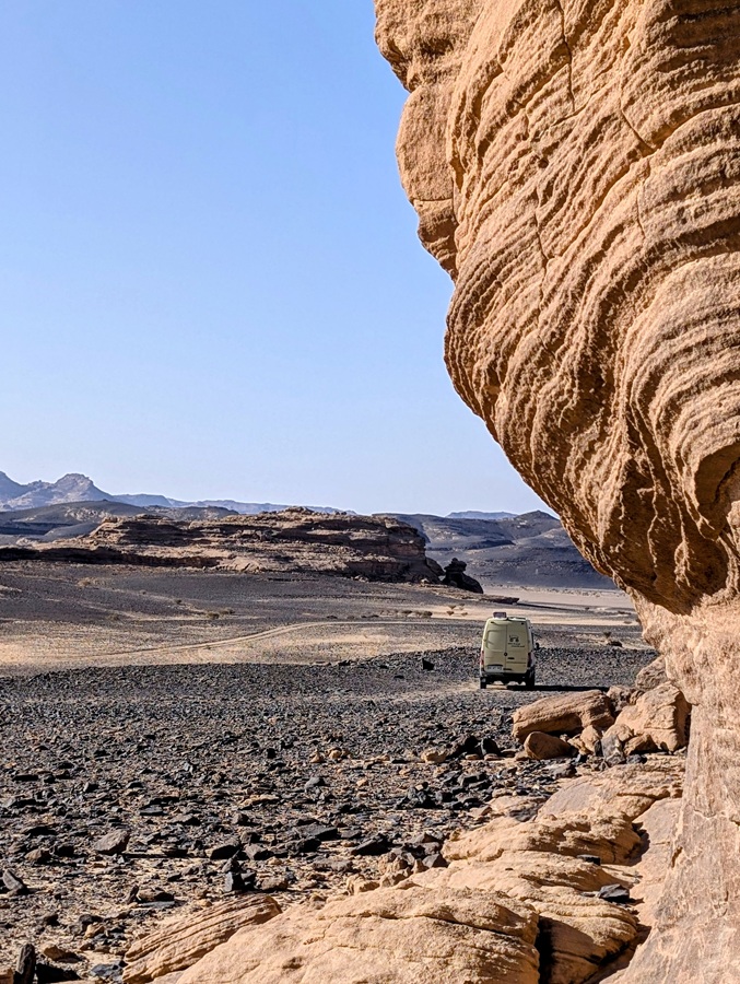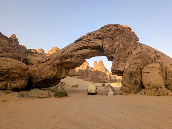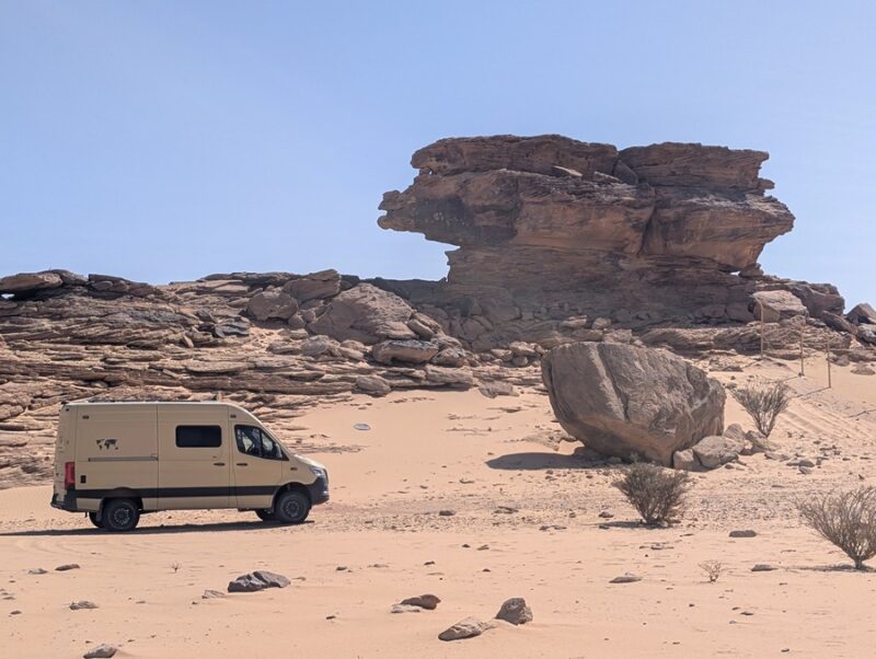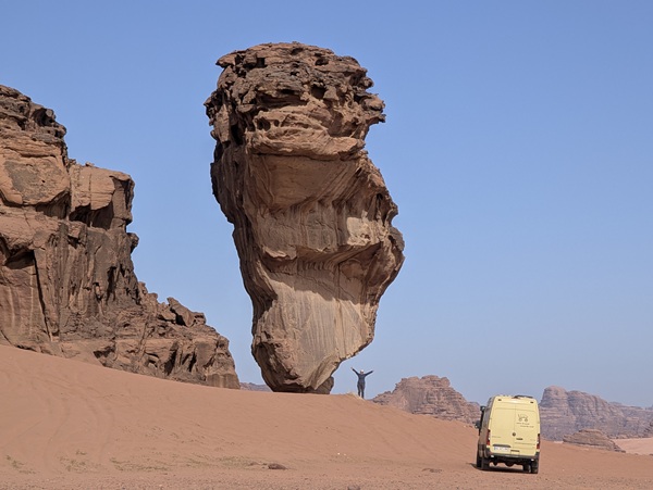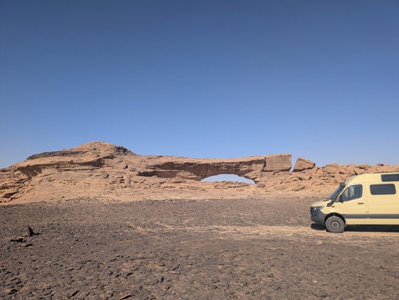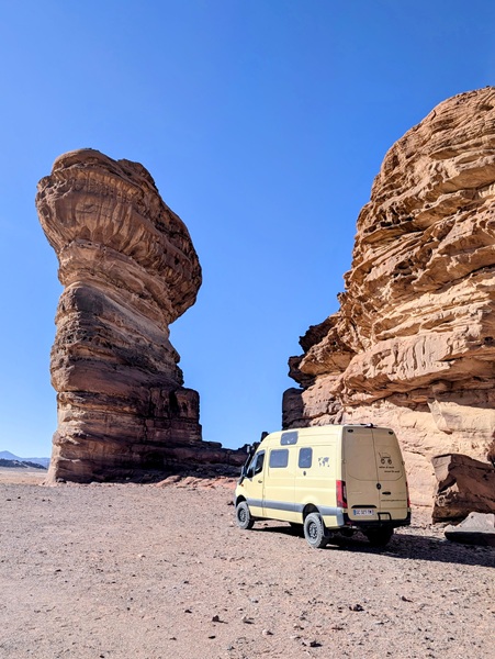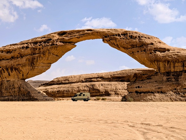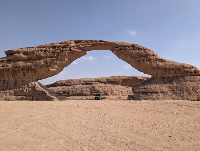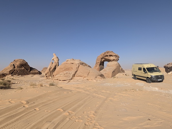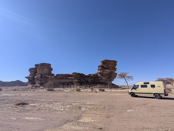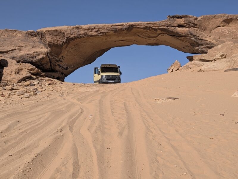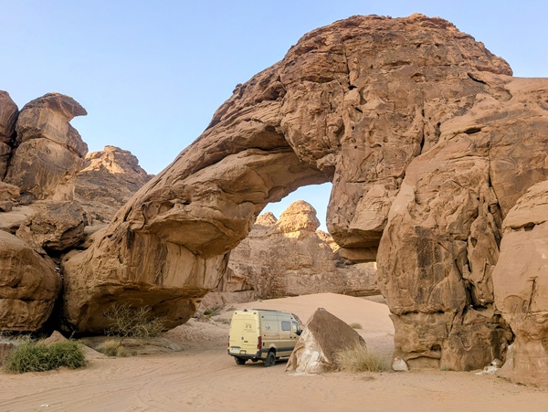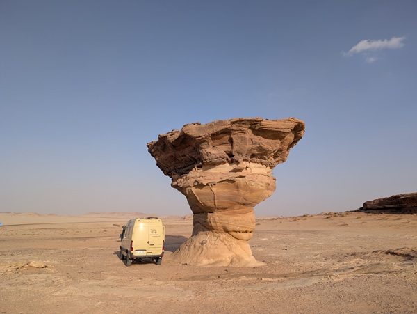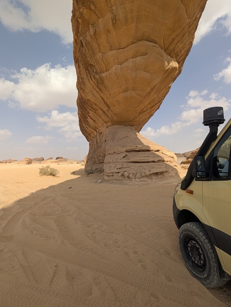 Après ce moment culturel, nous reprenons la route pour aller à Rainbow Arch et nous finissons la journée à Al Naslaa rock (roche fendue). La piste est sablonneuse mais Vagabond passe sans encombre.