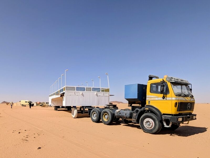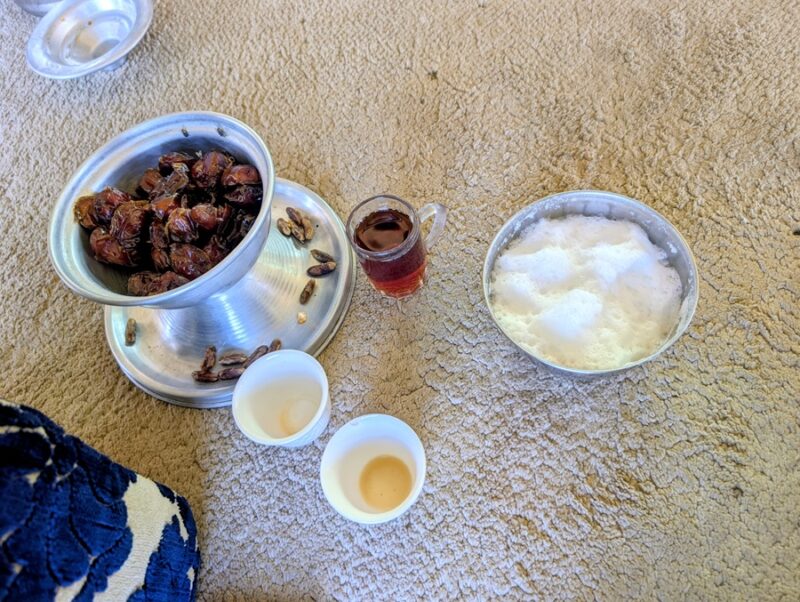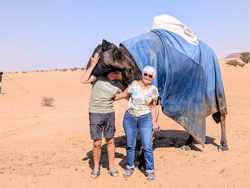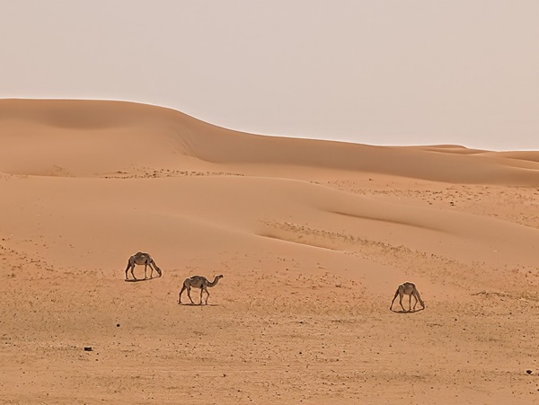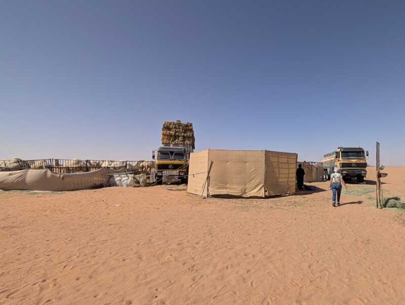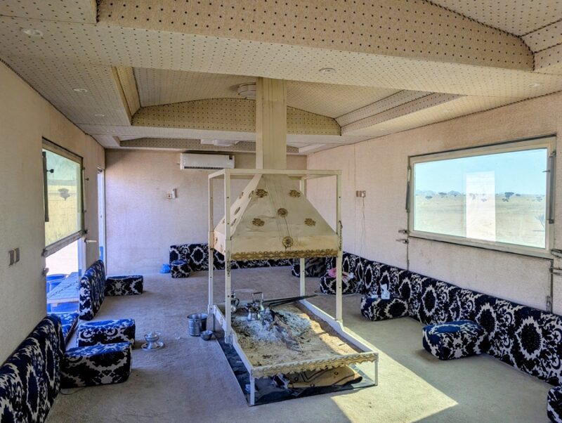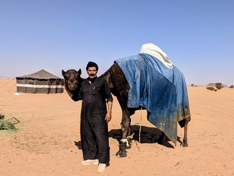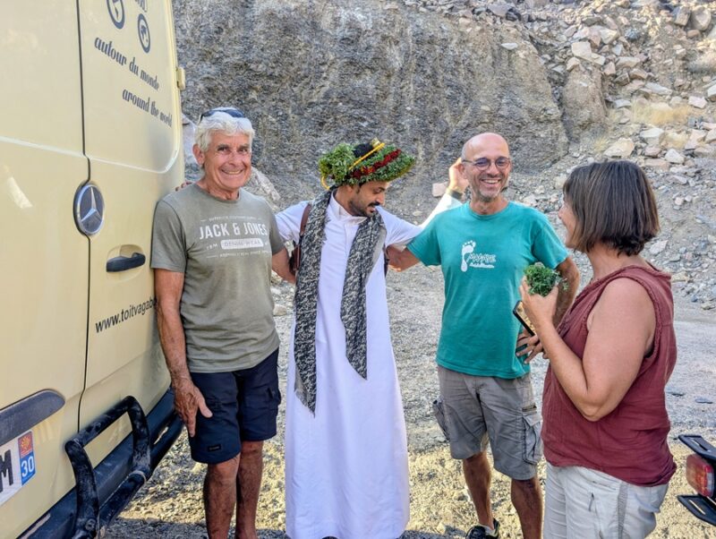 Nous décidons de les quitter pour suivre notre cap qui nous fera retomber sur une route. Alors que nous faisions le point, arrive un chamelier à bord de son 4×4 qui nous invite à le suivre pour nous offrir des bols de lait de dromadaire (bien crémeux) accompagnés de dattes, de thé et de café arabia qui a plus le goût d’un thé avec de la cardamone, c’est assez spécial. S’en est suivie la visite de son luxueux campement puis la photo avec son dromadaire vedette, vainqueur cette année d’une course renommée au Qatar. Visiblement ce chamelier était particulièrement aisé. Il possédait 4 camions Mercedes 6×6, l’un pour tracter une immense remorque terrasse, un pour son mobil-home, un pour la citerne d’eau et un dernier pour les bottes de fourrage…