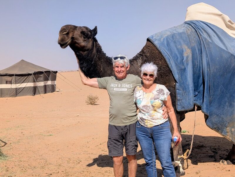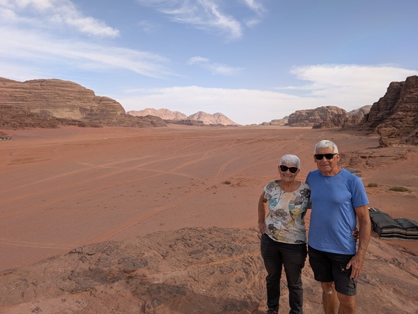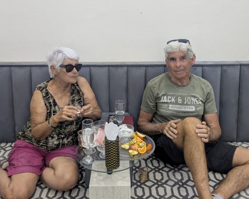 Alors que nous étions en bord de mer, un jeune couple franco-jordanien, Cynthia et Abdallad, s’arrête pour nous inviter à venir manger un plat traditionnel jordanien dont nous avons oublié le nom. La soirée fut très agréable et intéressante car nous avons appris pas mal de choses sur leurs coutumes. Les discussions se sont poursuivies le lendemain lors du copieux petit déjeuner qu’ils ont tenu à nous offrir. Leur bienveillance nous enchante toujours.