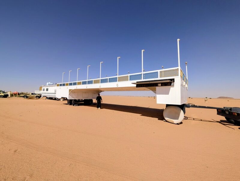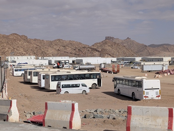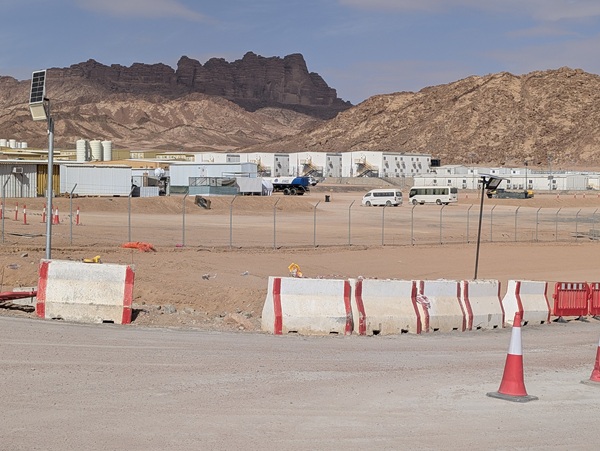 Le lendemain nous continuons le hors piste sur 35 km pour rejoindre une route goudronnée qui aurait dû nous amener vers le mont Al Lawz (2580m) mais arrivés en vue de la route, nous découvrons une véritable ville de bungalows. Renseignements pris, nous apprenons que nous sommes arrivés au milieu des hébergements pour les 10000 ouvriers travaillant sur le gros chantier « trojena » incluant une station de ski (30 km de pistes de neige artificielle), un lac pour les sports nautiques, un observatoire astronomique, une réserve de vie sauvage, nombreux hôtels, restaurants et commerces. Tout cela bien sûr dans un parfait respect de l’environnement…