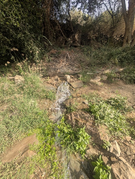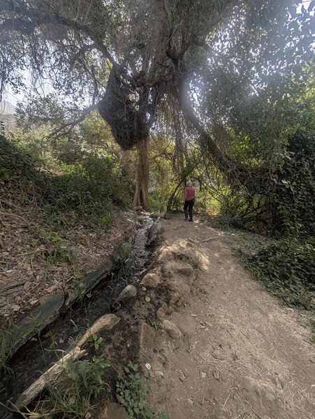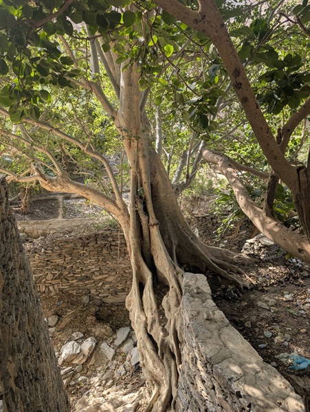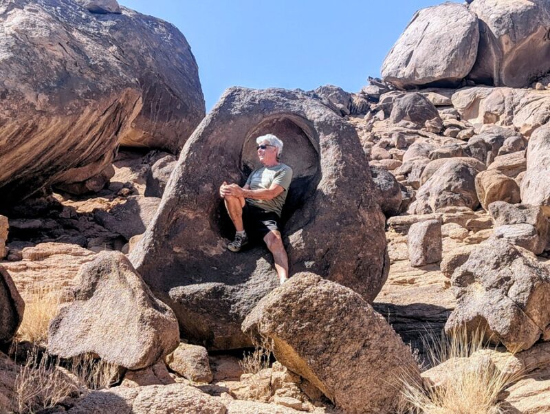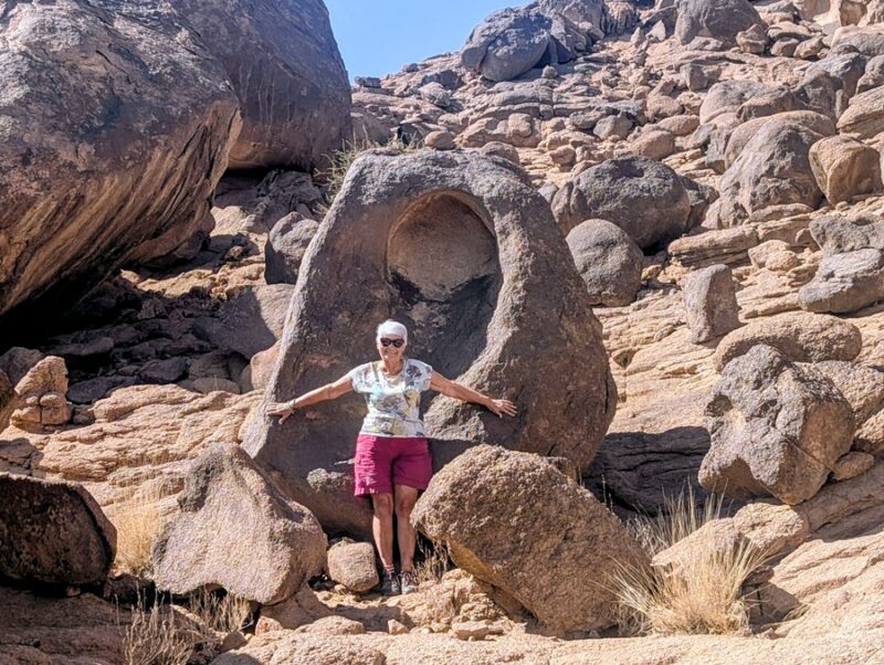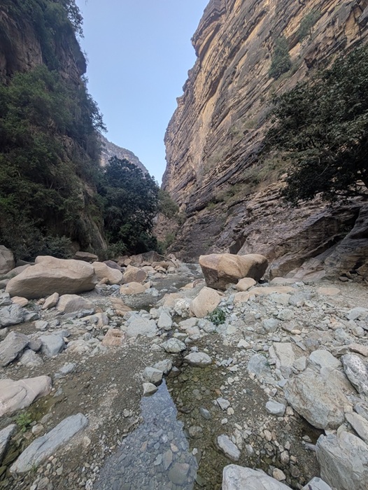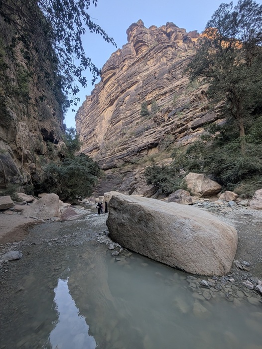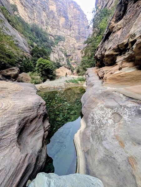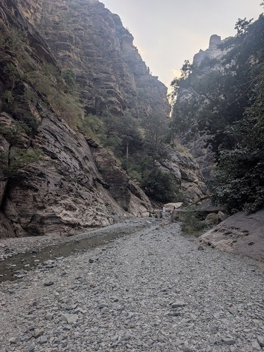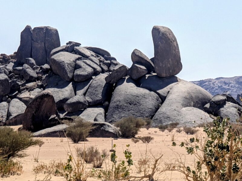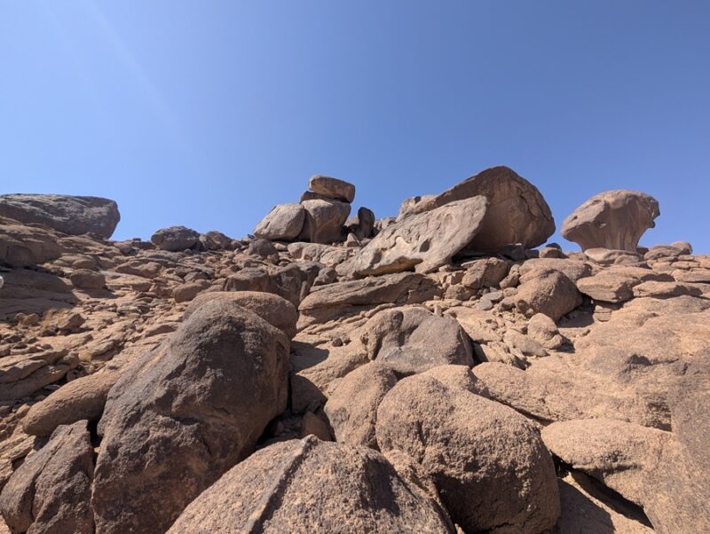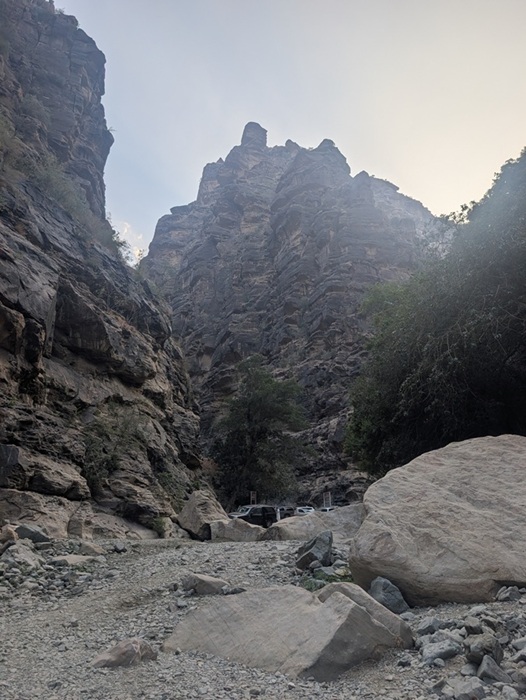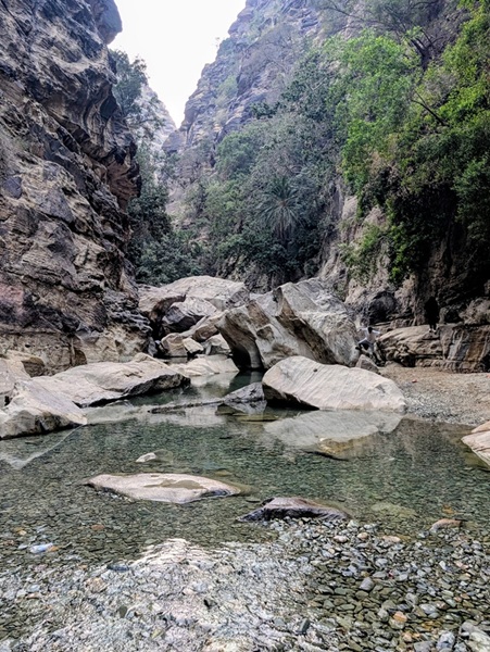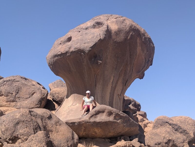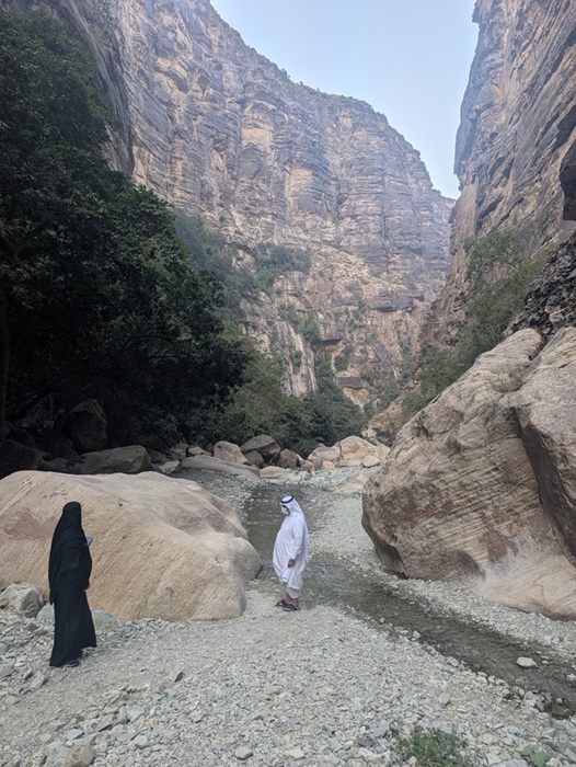 En fin d’après-midi nous arrivons au wadi Lajab au fond duquel coule un peu d’eau. Nous nous promenons au milieu de ces rochers ronds et un petit garçon de 7-8 ans interpelle Françoise semblant choqué qu’elle ne porte pas le niqab . Elle lui dit en anglais qu’elle est française et sa mère lui explique qu’en France c’est comme ça que les femmes s’habillent .