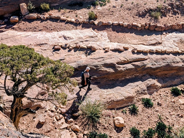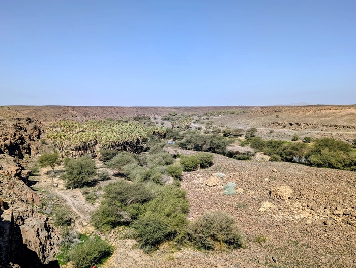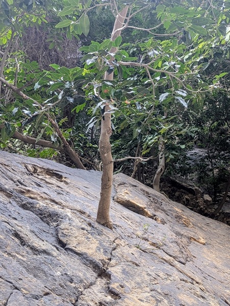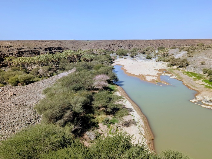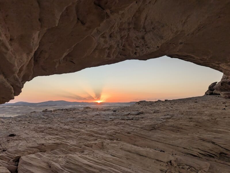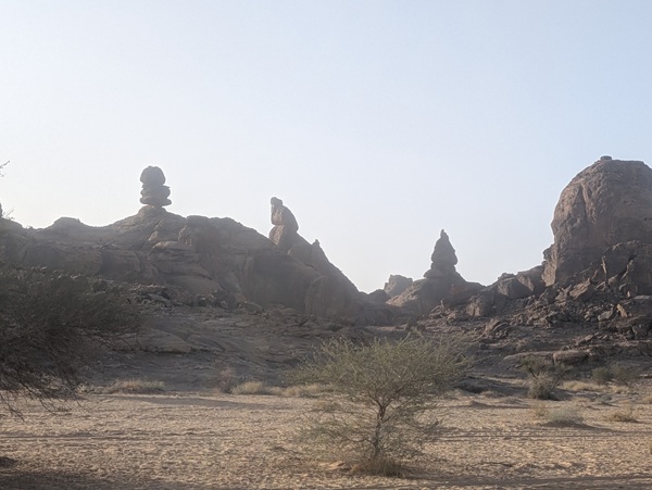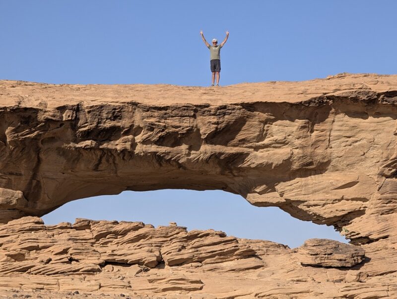A Thar la température commence à monter, 28° à midi, et pour la 1ère fois nous cherchons l’ombre pour le dîner. C’est au pied d’un rocher que nous la trouvons sans peine. Puis direction une arche naturelle où nous bivouaquerons