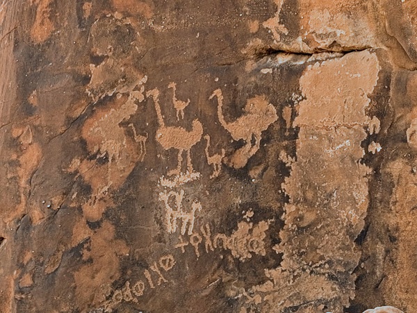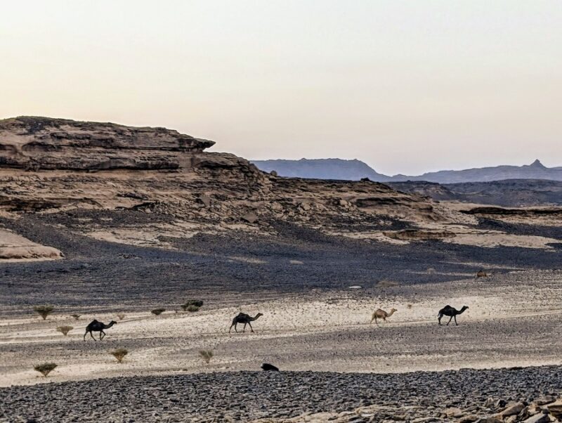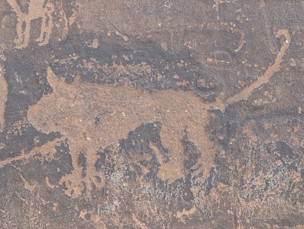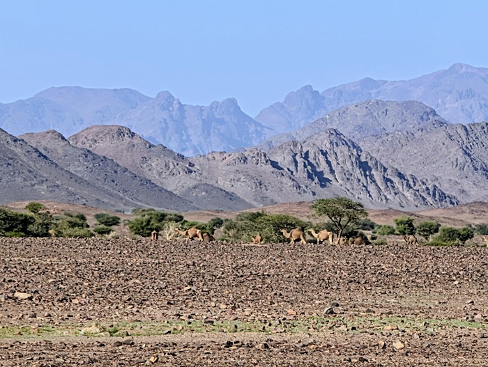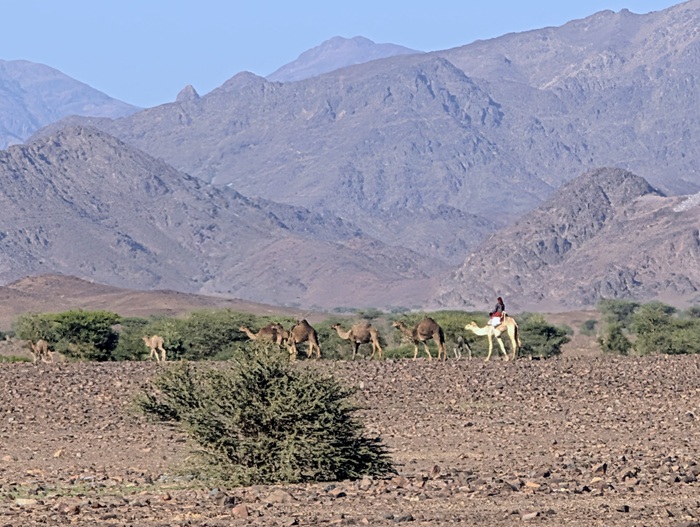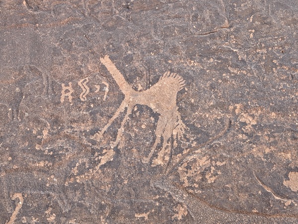 Notre guide (papier) nous recommande de nous rendre à une arche naturelle plus au sud. Nous partons au cap à travers les pistes sablonneuses et de rocailles noires comme nous aimons, en rencontrant de temps en temps des dromadaires qui marchent tranquillement. Après quelques kilomètres nous arrivons à cette grand arche. Nous prenons les photos traditionnelles avant de repartir vers un site archéologique classé par l’UNESCO pour la plus grande peinture du royaume d’un dromadaire datée de 1500 ans A.J.C.