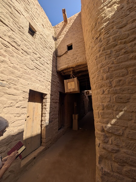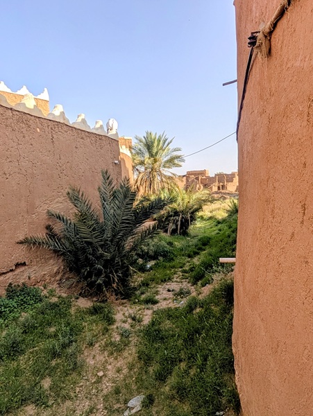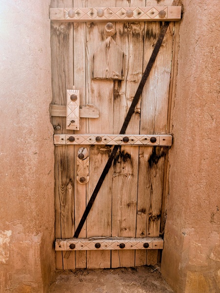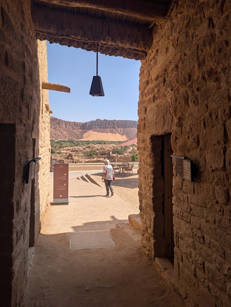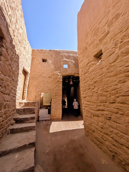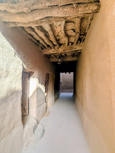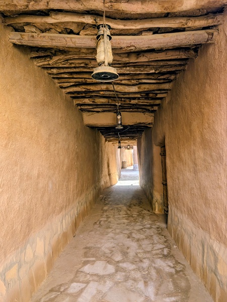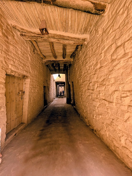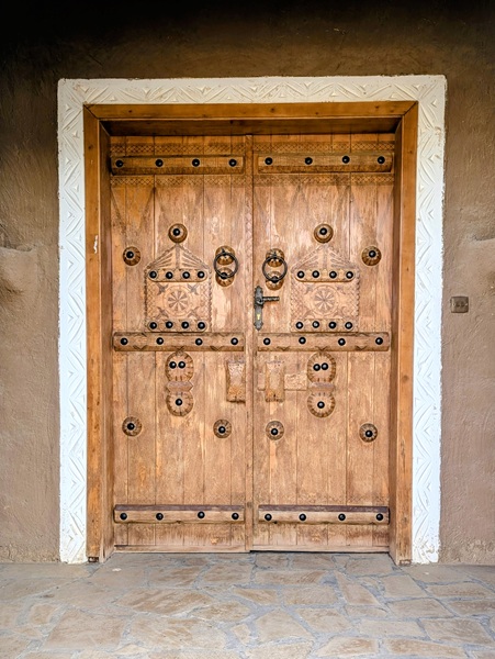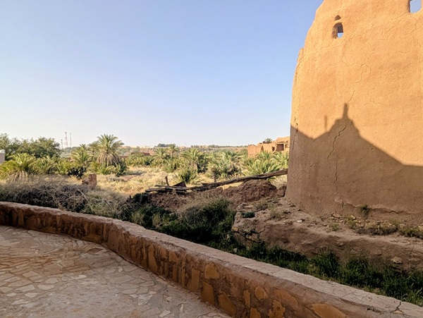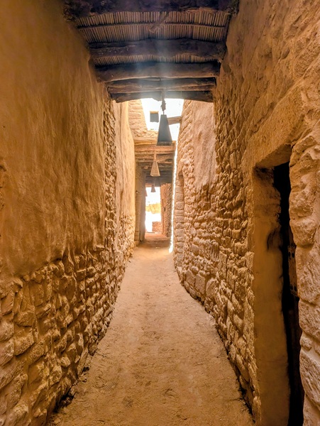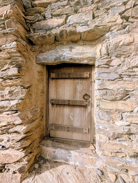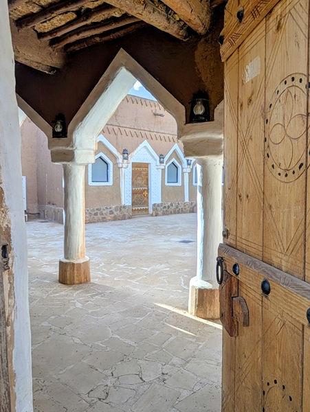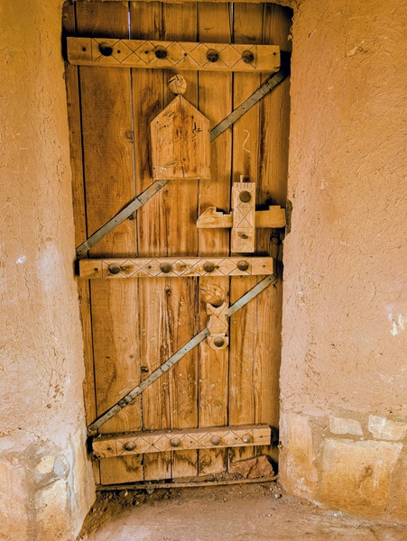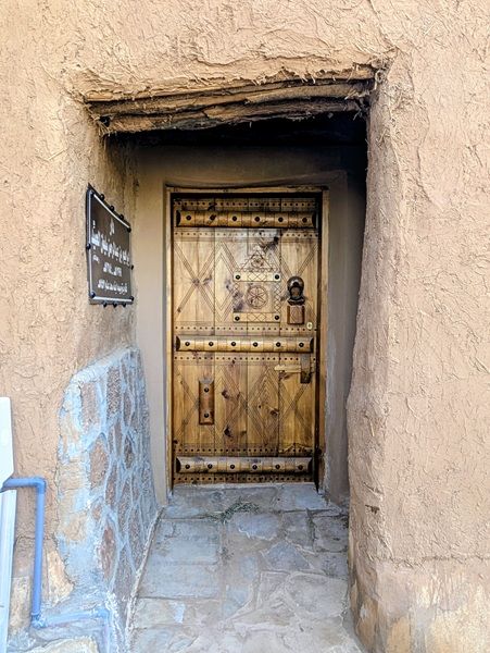 En descendant vers le sud, nous nous arrêtons à Ushaiquer un village historique en cours de restauration, au milieu d’une oasis. Les murs sont en pisé avec de belles portes en bois.