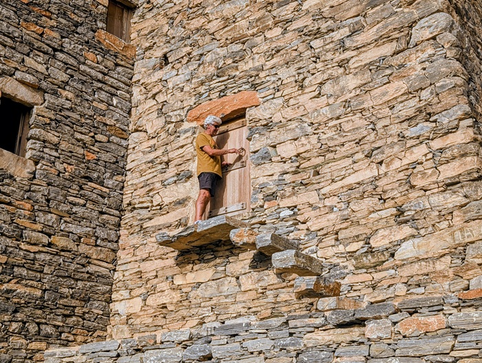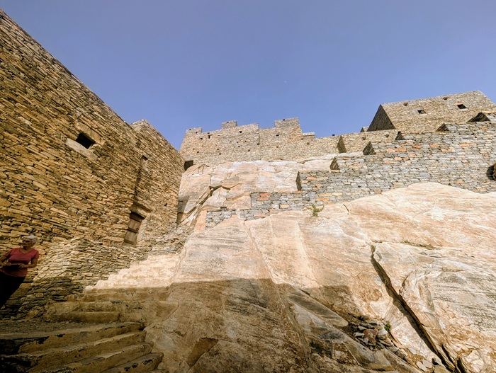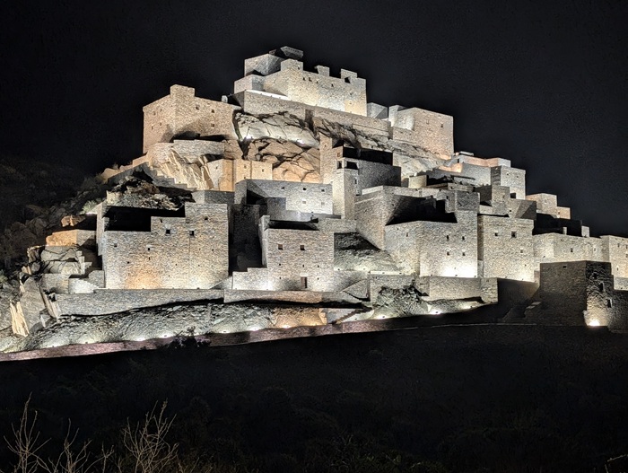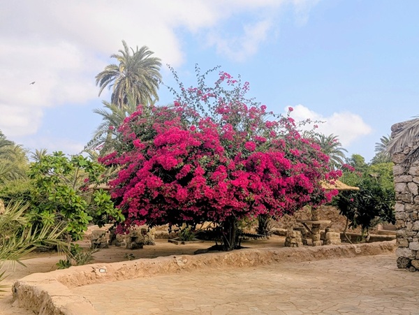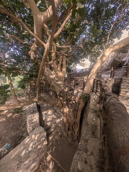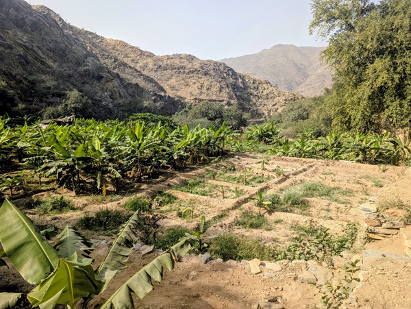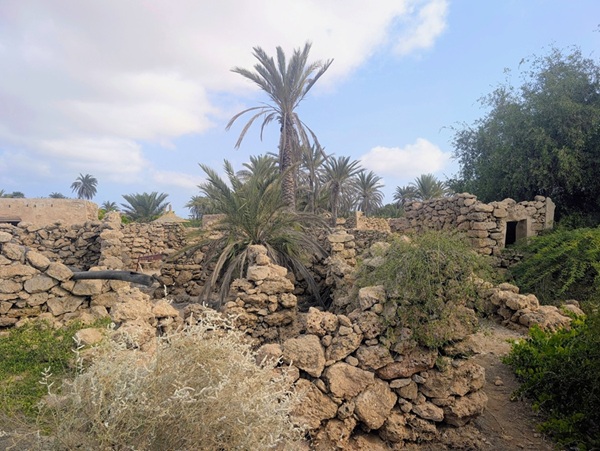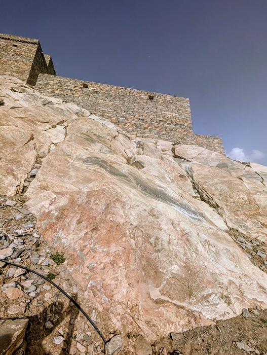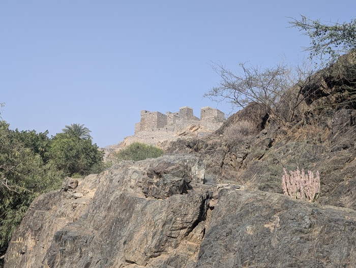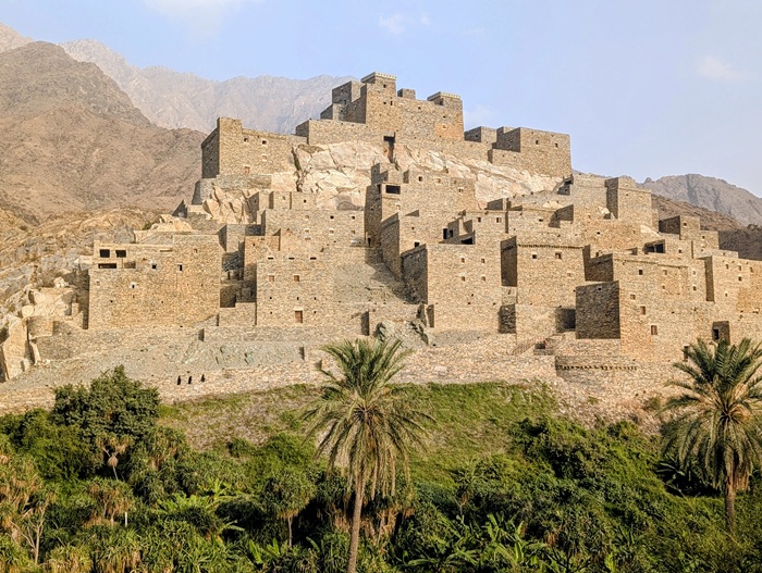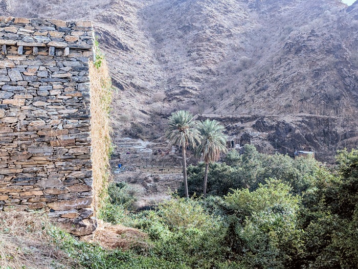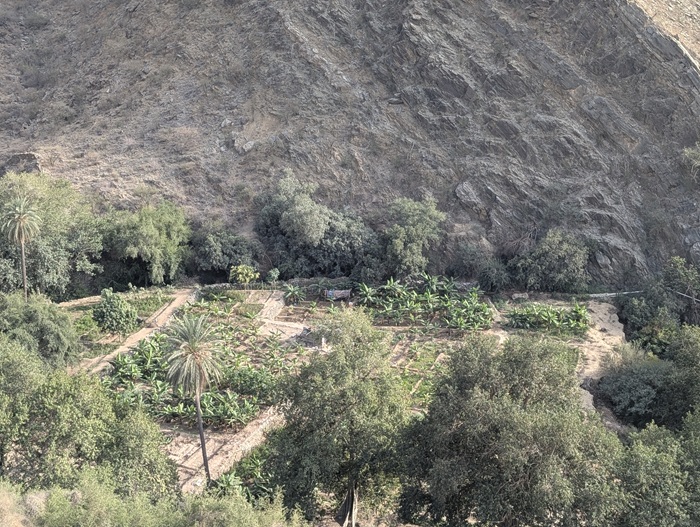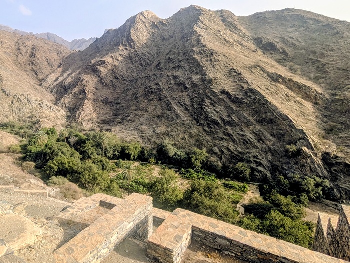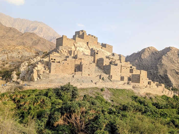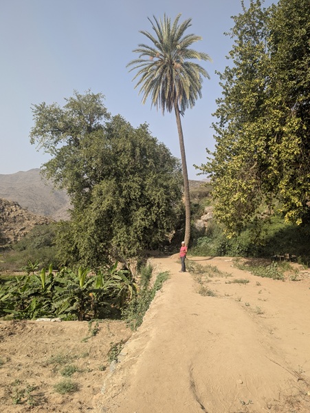 Zee al Ain heritage village construit sur une butte, tout en pierre de marbre et de quartz. A sa base, une source a permis une belle oasis avec palmiers, bananiers et autres jardins. Pour y arriver, nous avons effectué une descente de plus de 1500m de dénivelé d’un seul tenant.