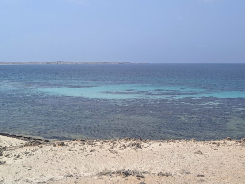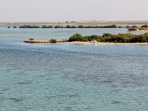 Quelques kilomètres plus bas au bord de la mer, nous prenons le ferry pour les îles Farasan. Par contre Françoise doit passer en dehors du véhicule pour le contrôle. Elle se retrouve assez mal à l’aise au milieu d’une foule de femmes uniformément vêtues de leurs niqabs noirs, alors qu’elle est en jupe culotte rose ainsi qu’un tee-shirt rose.
