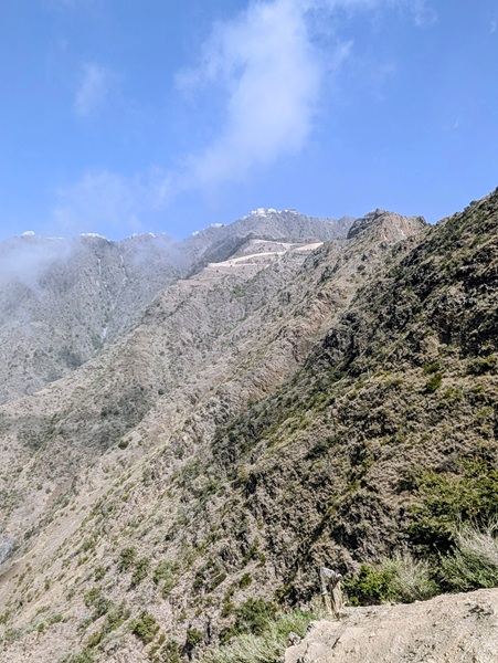 Puis nous continuons notre route à travers de grandes montagnes enchaînant montées abruptes, descentes vertigineuses, nous avons l’impression de faire des montagnes russes, passage à 2400m puis redescente à 1000m en quelques kilomètres. Les paysages sont plus variés avec quelques tâches de verdure dont un vignoble.