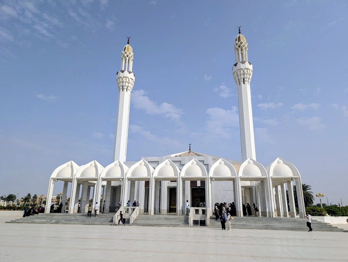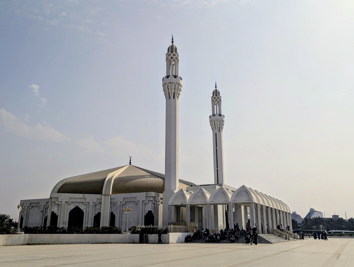 Nous profitons d’être dans les grandes villes pour nous rendre au supermarché et faire le plein de produits frais et secs. Nous n’aimons pas beaucoup visiter les centres villes, encore une fois nous nous dirigeons vers la corniche de Djedah pour dîner en bord de mer et à côté d’une grande mosquée.