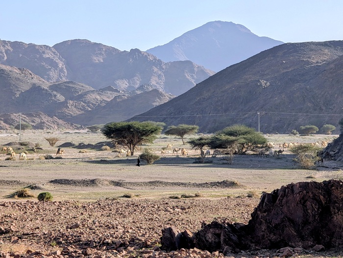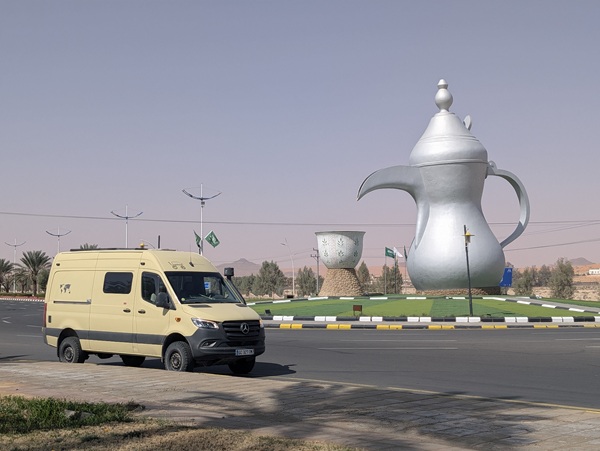 Avant d’entrer dans la ville nous bivouaquons sur un terrain vague squatté par de nombreux camps nomades. En Arabie Saoudite les gens s’installent où ils veulent, viennent passer la soirée, écouter la musique (pas trop forte) mais ne dorment jamais sur place ce qui nous étonne toujours.