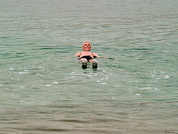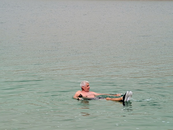 Puis direction la plage où nous pouvons nous baigner dans la mer morte. L’extrême salinité de l’eau (275gr/litre) rend la nage difficile tant nos corps sont peu immergés mais l’expérience était sympa, d’autant plus que maintenant nous allons pouvoir nous vanter d’avoir nagé à -440m sans bouteilles! Nous sommes en effet au point le plus bas de la terre.