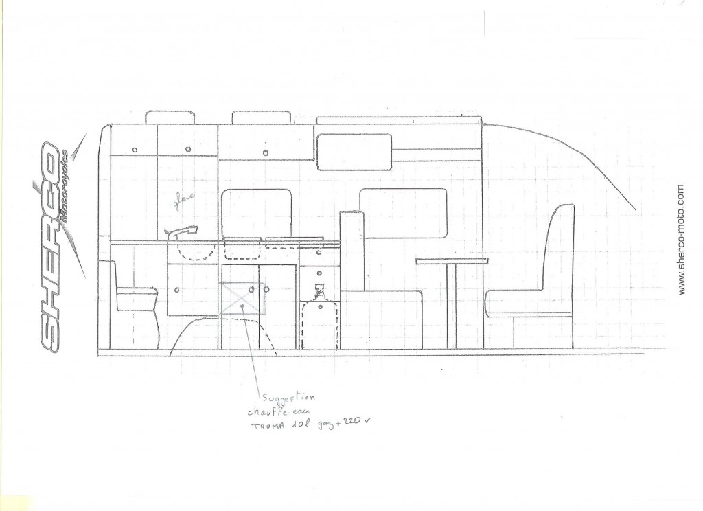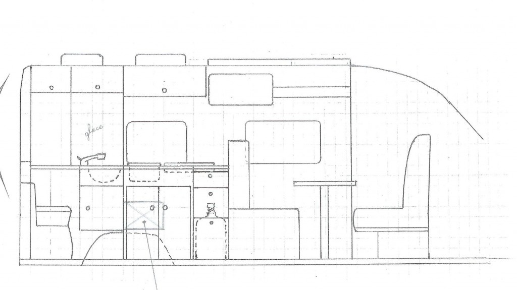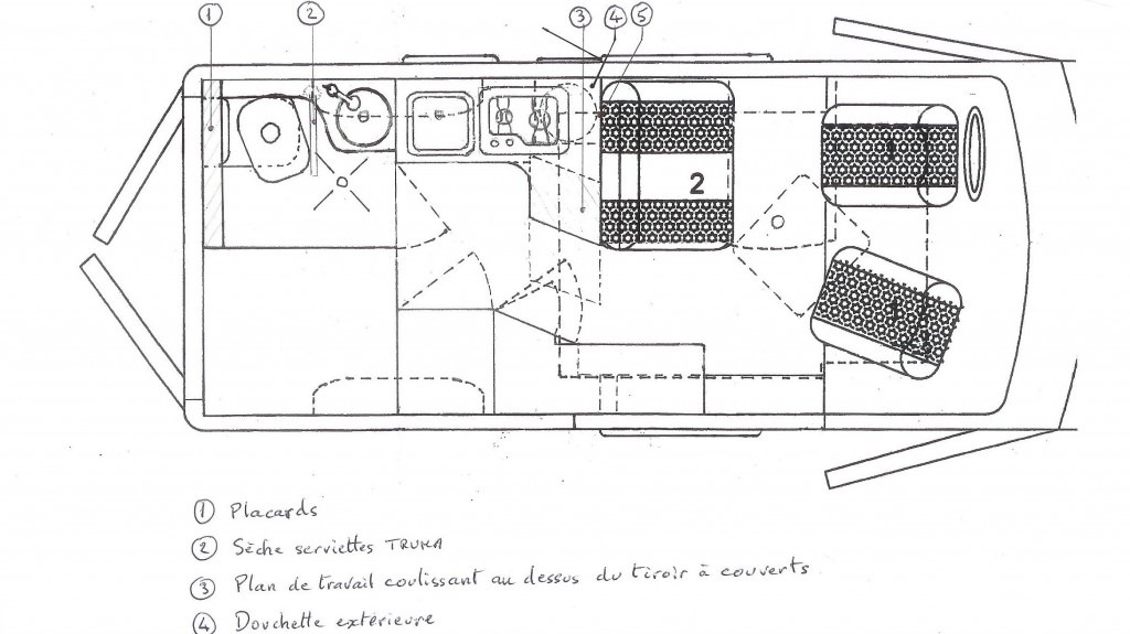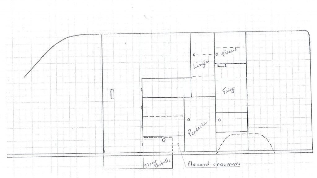 Avant de créer les plans d’aménagement, Alain a déterminé le volume du coffre en fonction du matériel que nous voulions emporter. De plus il tenait à ce qu’il soit accessible seulement par une porte AR afin de pouvoir le sécuriser. Pour la partie habitable, en prenant en compte les volumes de rangement que nous souhaitions et d’une cuisine en L avec plan de travail, un frigo de 130 l en hauteur, la solution du lit de pavillon s’est imposée pour nous laisser un espace de vie confortable.