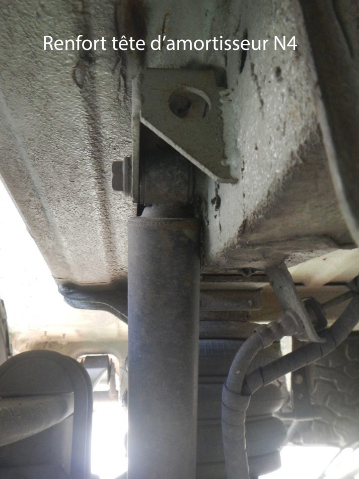 Ensuite les boulons de fixation de tête supérieure se sont tour à tour cassés au ras du chassis. J’en ai donc déduit que le montage de ces boulons en porte à faux n’est pas adapté à des amortisseurs plus efficaces et donc plus freinés que ceux d’origine. Je me suis donc procuré les pattes de renfort « N4 » pour le montage « en chappe »ainsi que les pattes de renfort des fixations inférieures. Ne connaissant pas de coupelles silent blocs renforcées pour l’AV, je continuerai avec les amortisseurs d’origine.